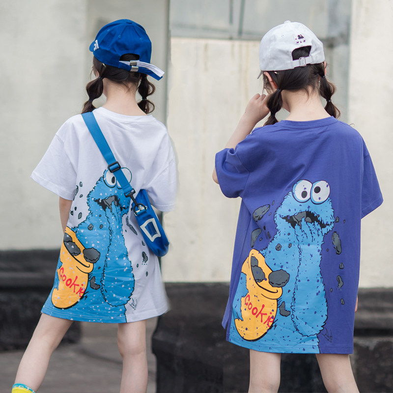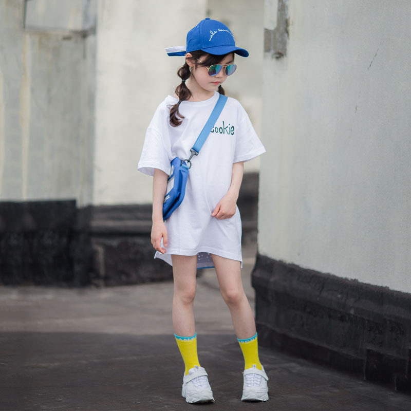 女童短袖t恤洋气时尚中长款宽松白色上衣纯棉卡通夏天衣服亲子装