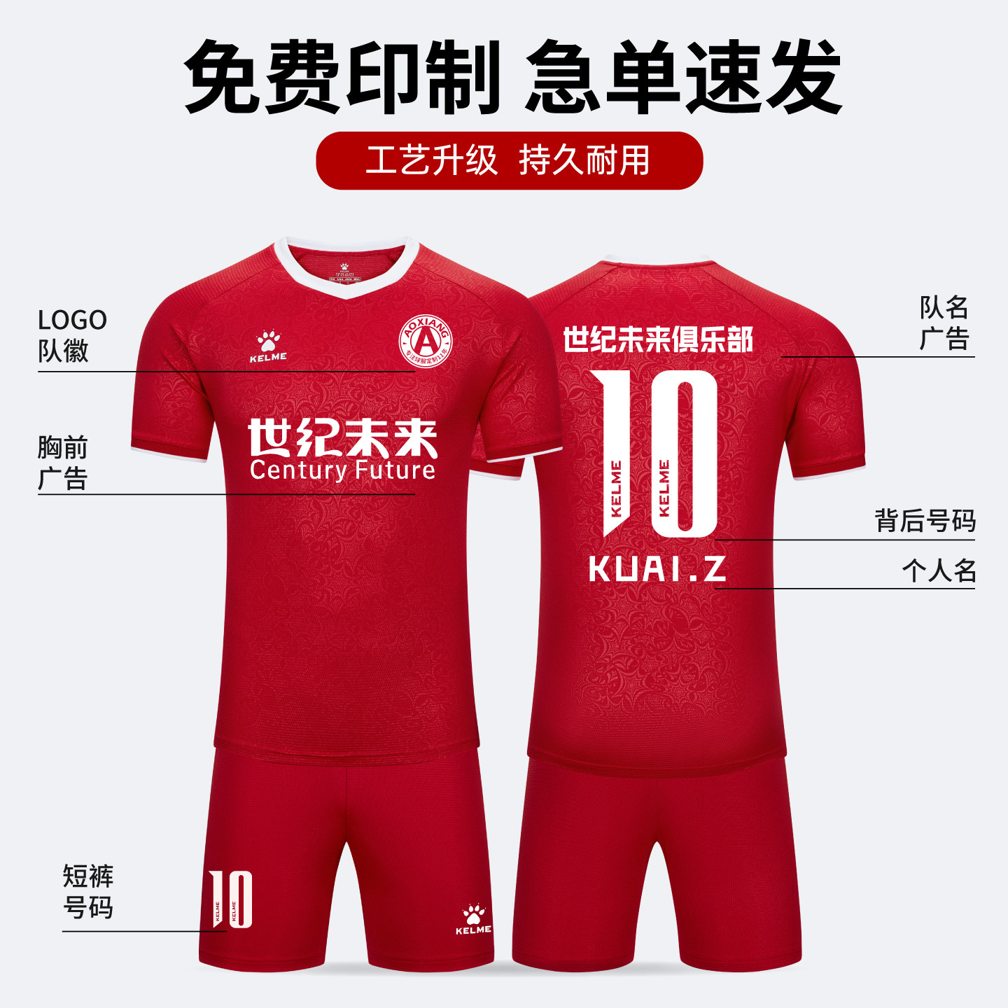 KELME卡尔美新款足球服成人训练服定制球衣套装青少年比赛组队服