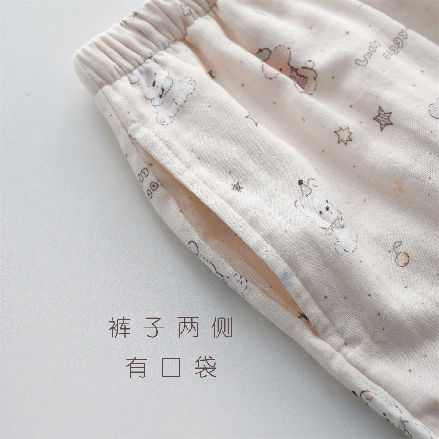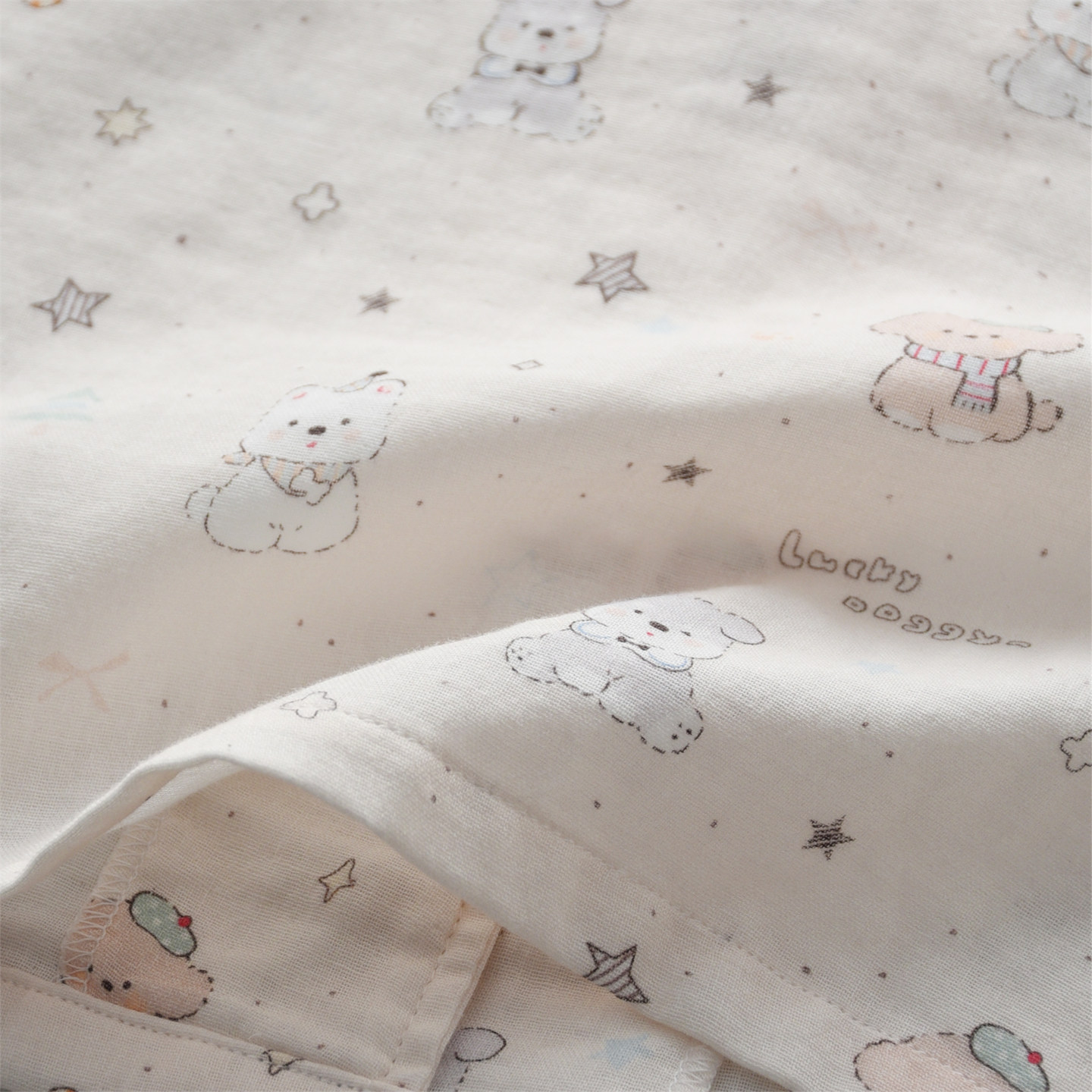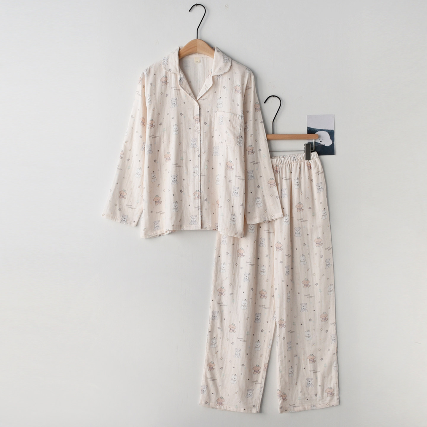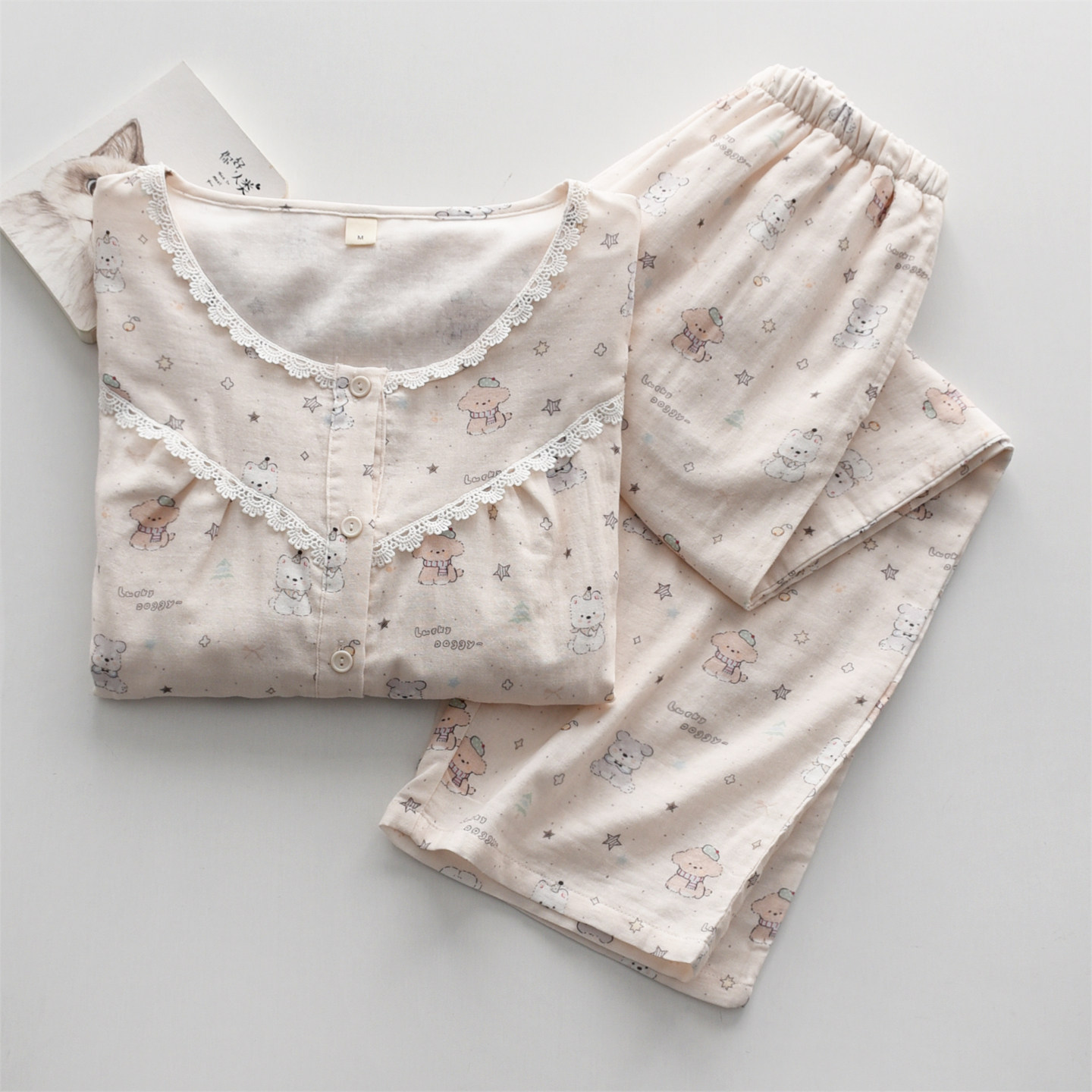 星愿卡通小狗印花睡衣女款春夏季纯棉纱布双层薄款长袖家居服套装