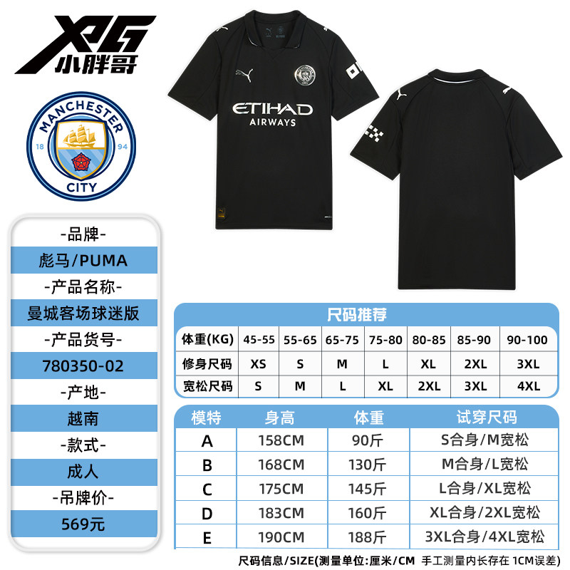 小胖哥XPG彪马25-26曼城客场球迷版短袖球衣比赛训练成人足球服男