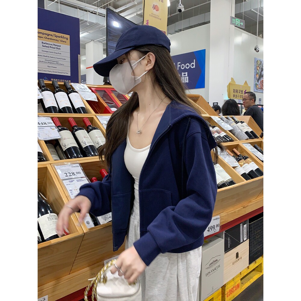 开衫连帽卫衣女款2025新款春秋冬小个子藏青色爆款加绒短款厚外套