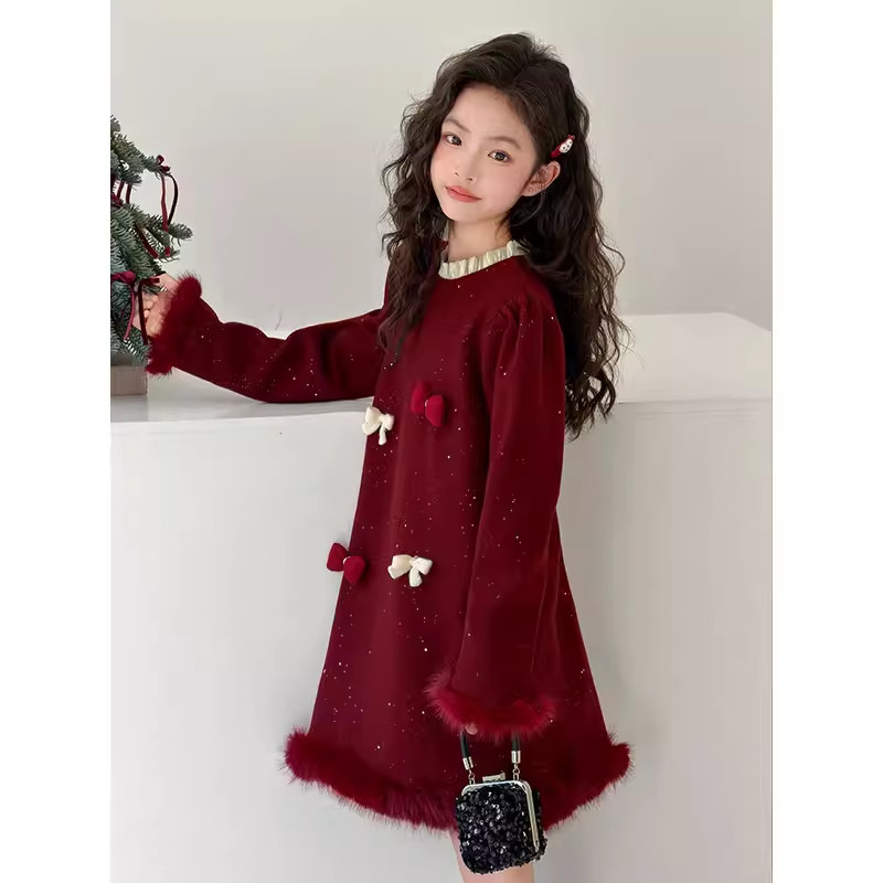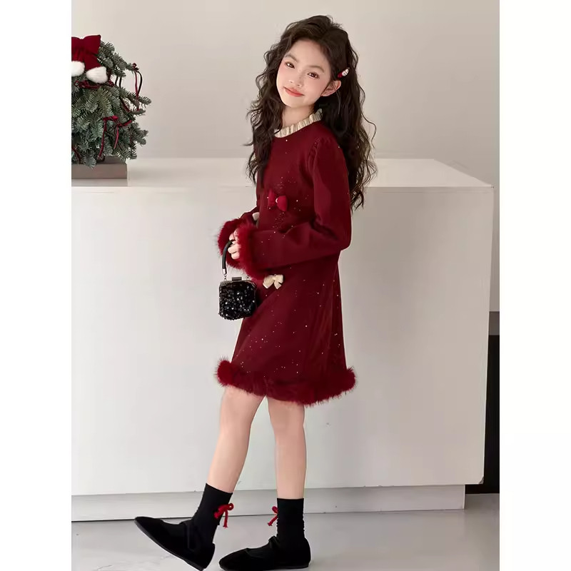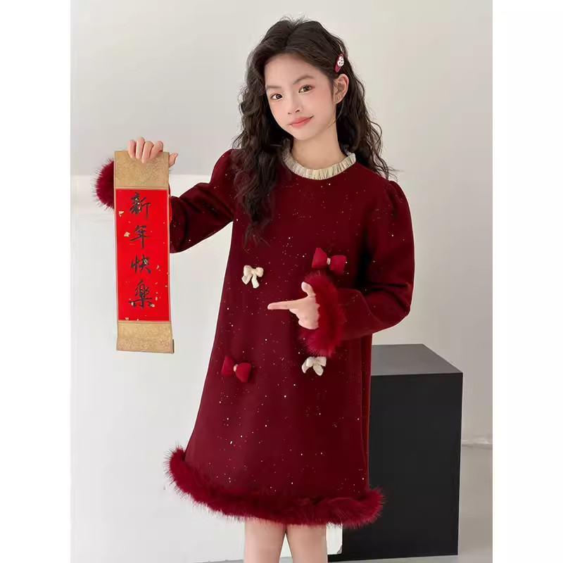 女童冬装高级感连衣裙儿童红色拜年礼服加绒裙子大童好看公主裙厚