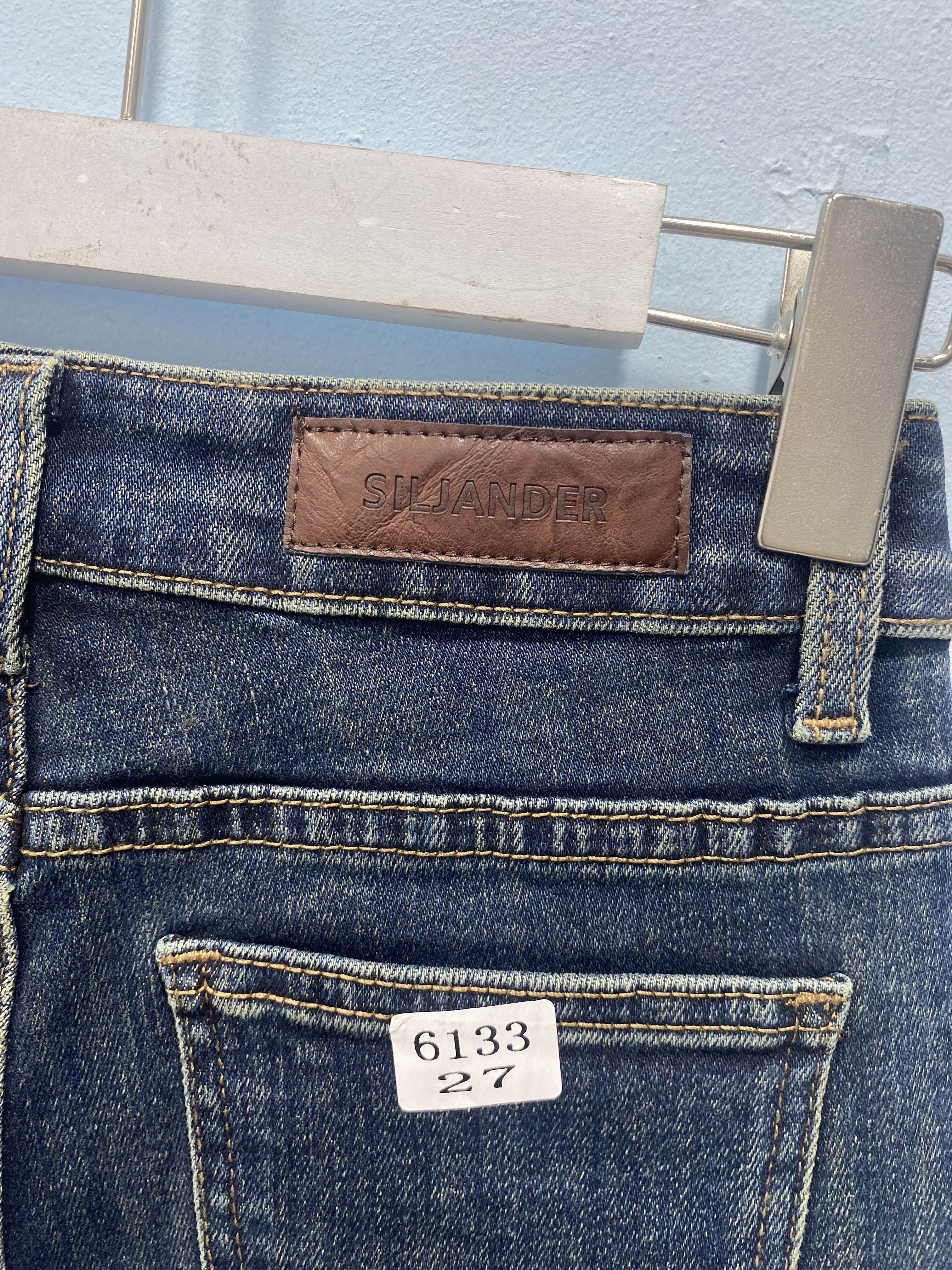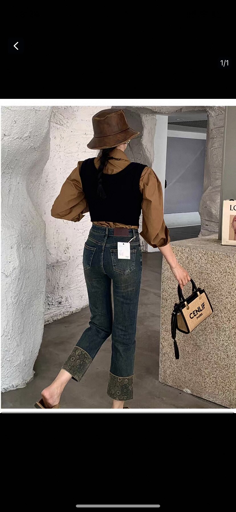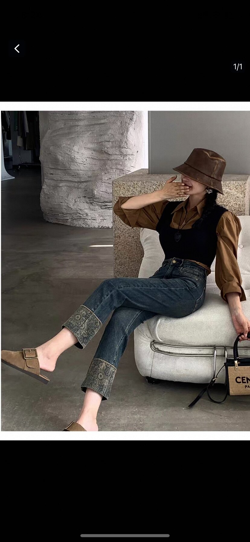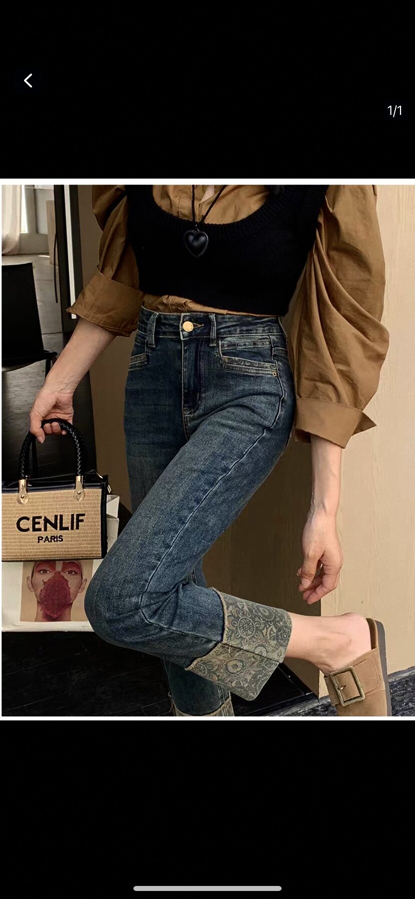 弹力九分牛仔裤女2026春秋季新款复古翻边印花小个子直筒烟管裤女