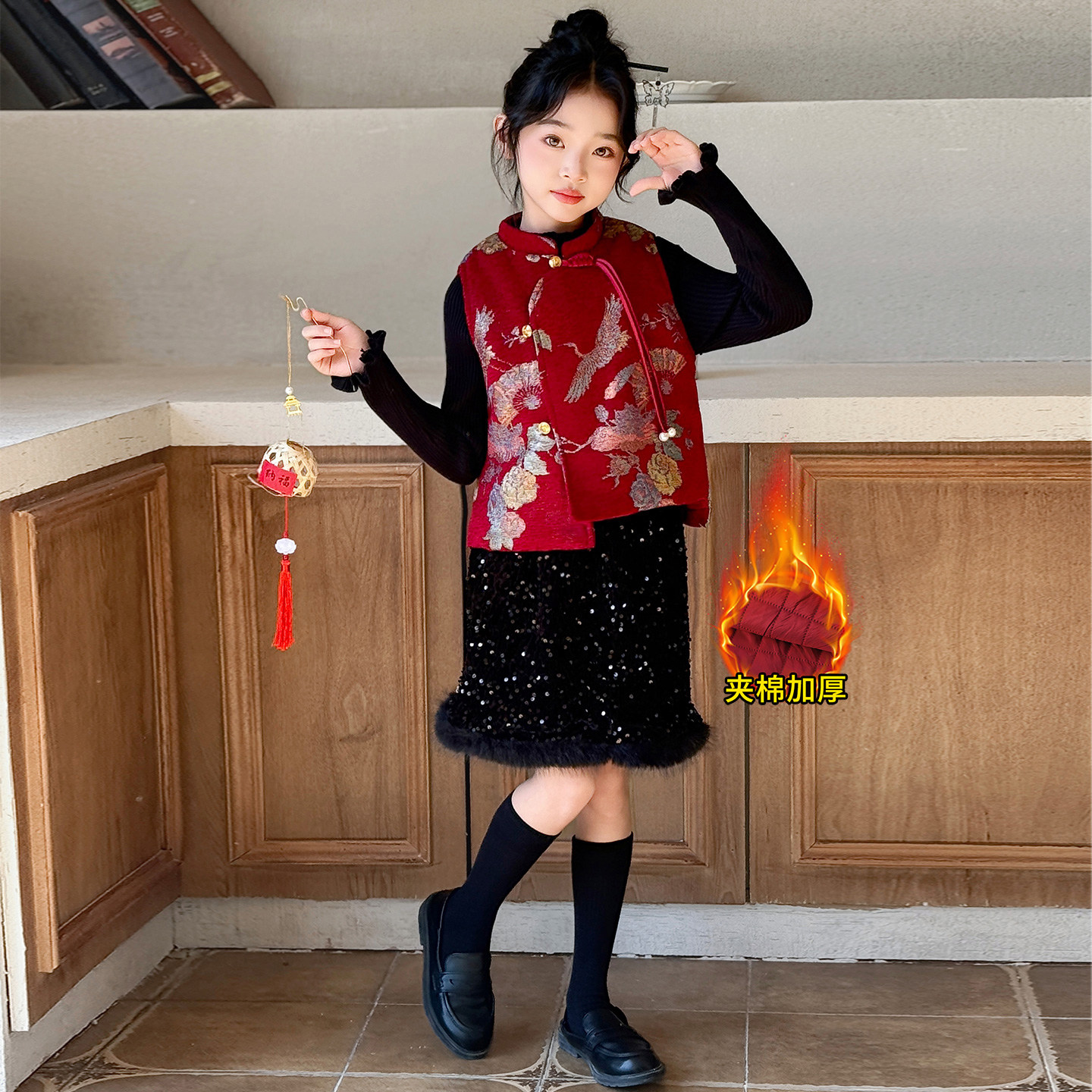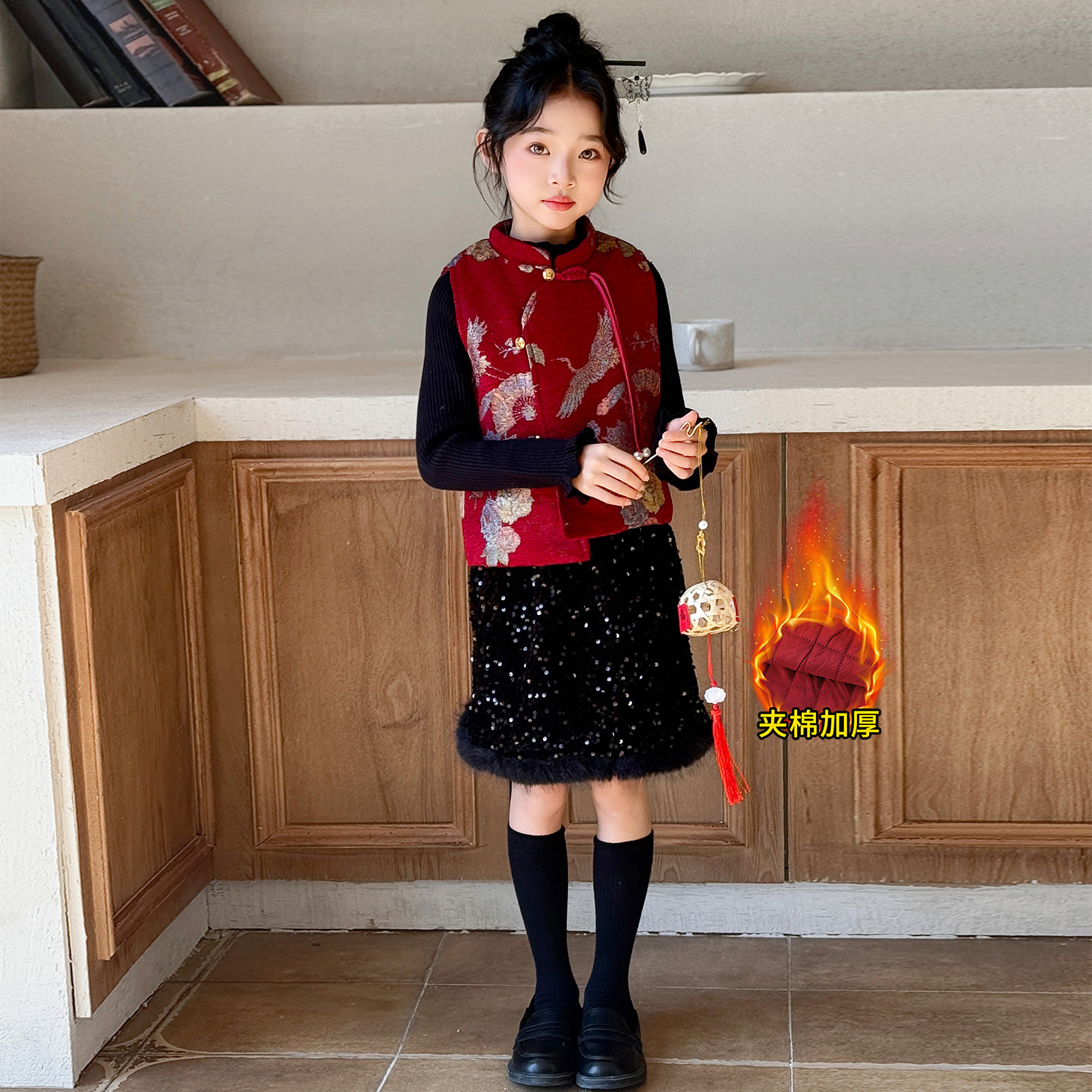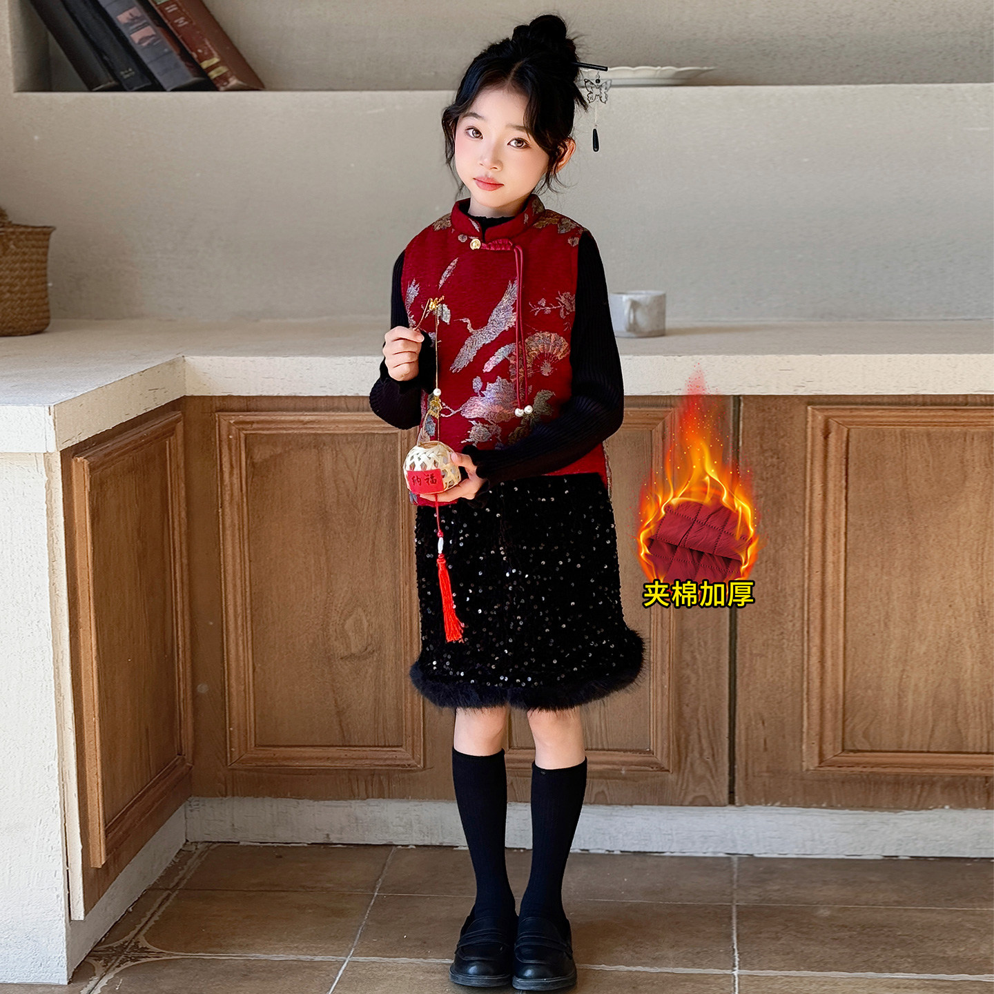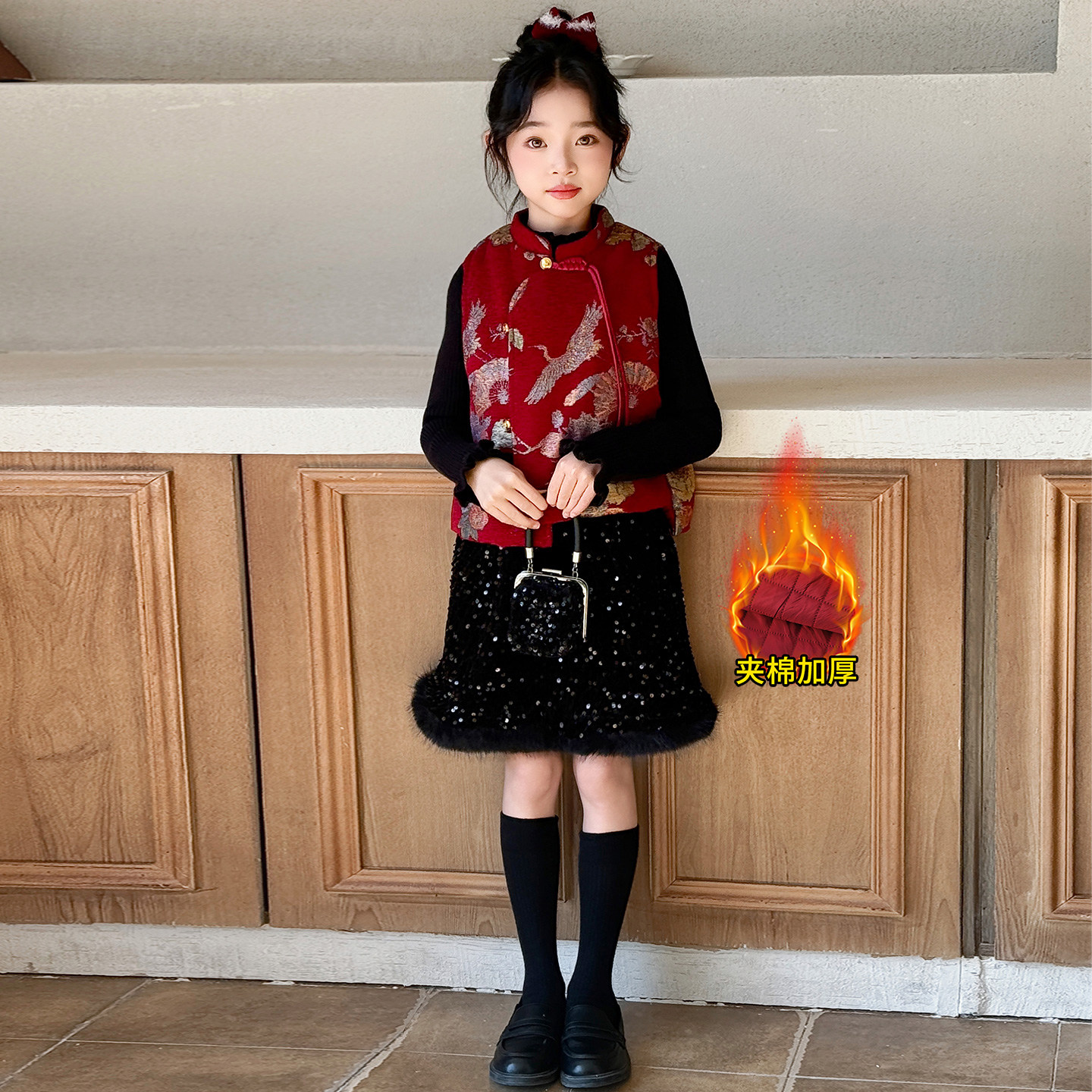女童冬季中国风年服三件套2026新款女孩夹棉马甲打底衫半身裙冬款