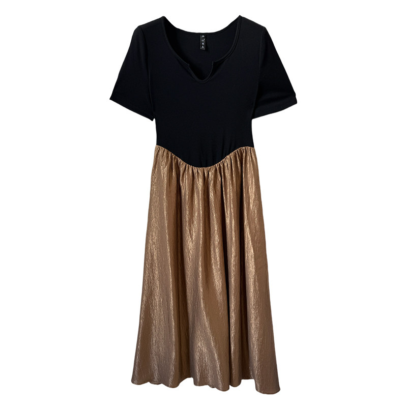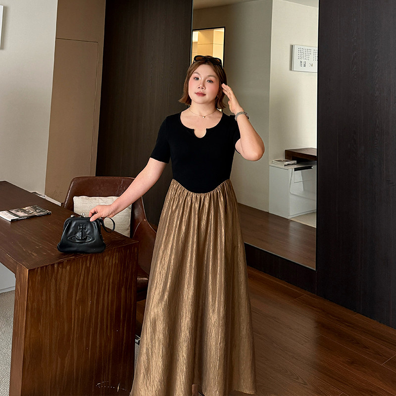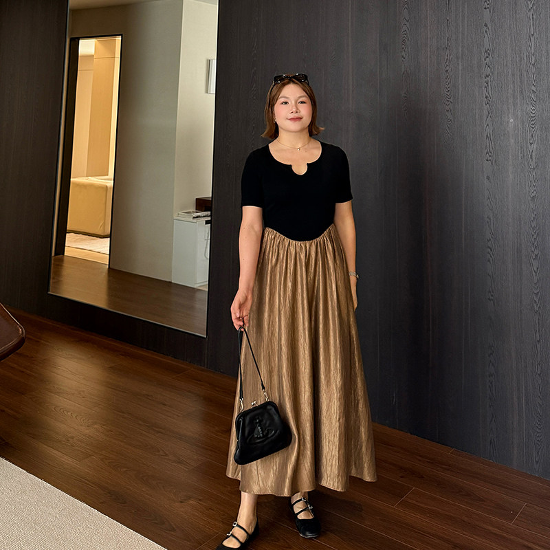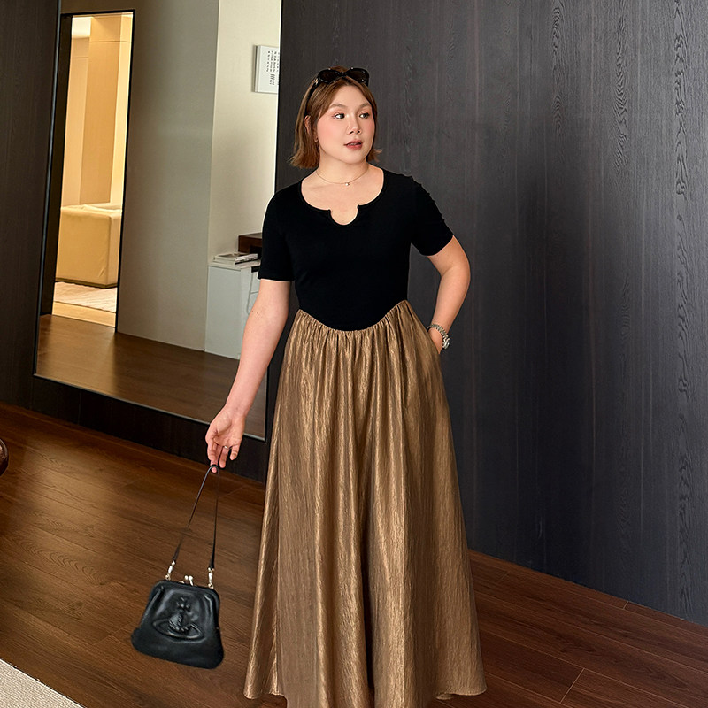 巨显瘦气质拼接收腰裙2025夏新款大码胖mm显瘦遮肚子撞色连衣裙