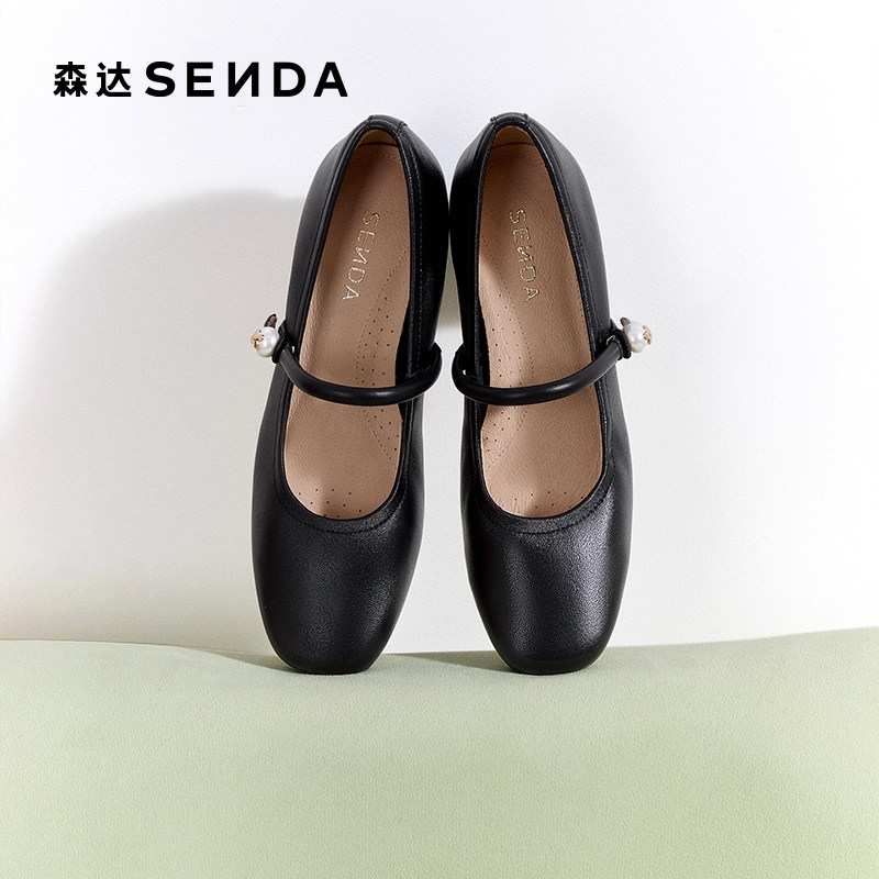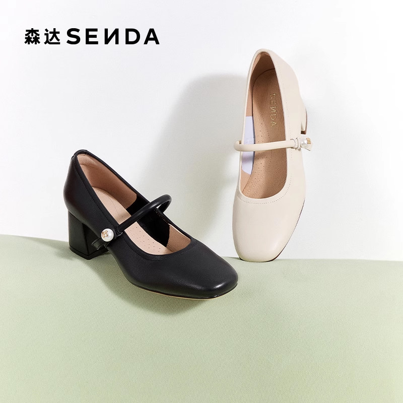 森达超软羊皮不累脚玛丽珍女鞋春秋新款商场同款粗跟浅口高跟单鞋