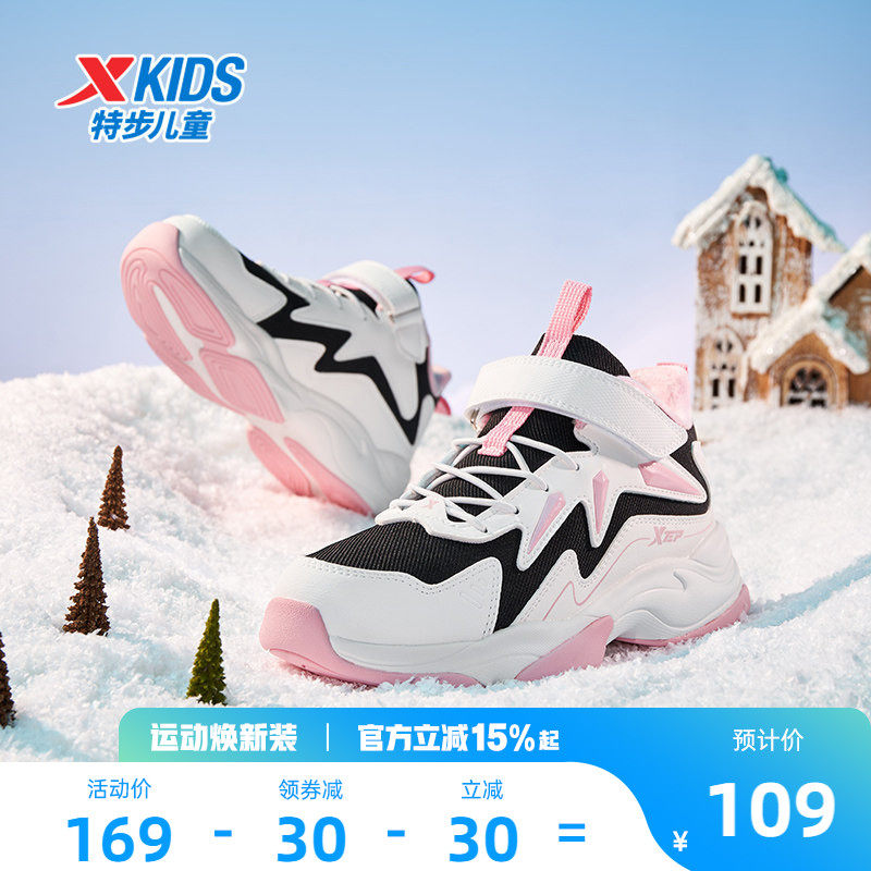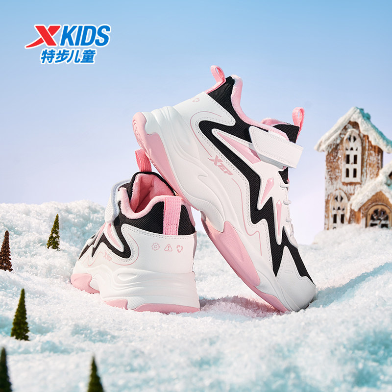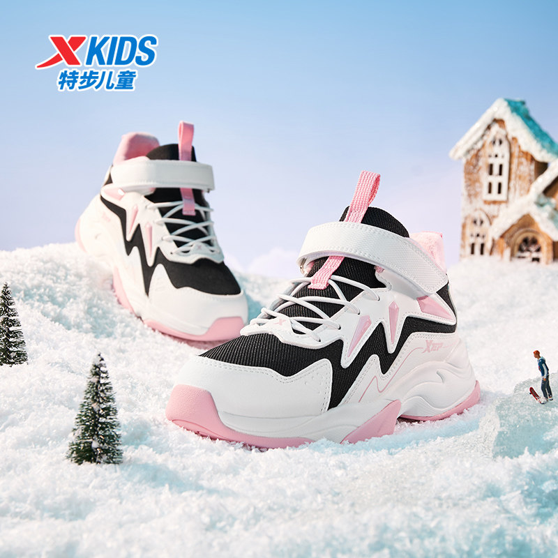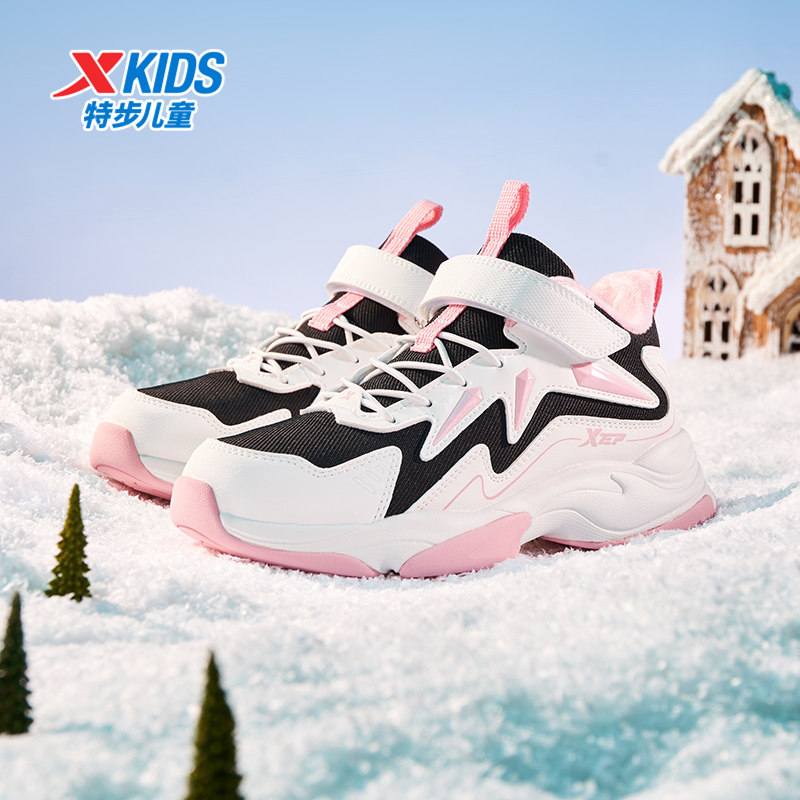 特步童鞋冬季新款女童中大童耐磨防滑加绒休闲魔术贴儿童运动棉鞋