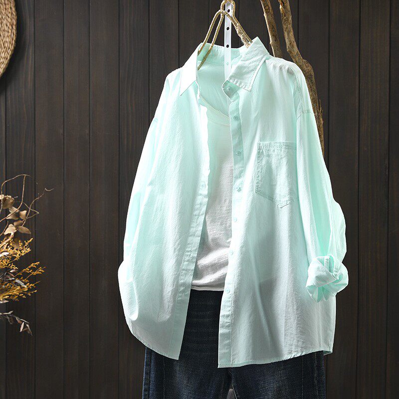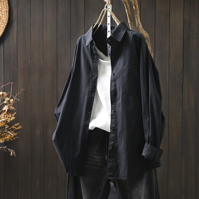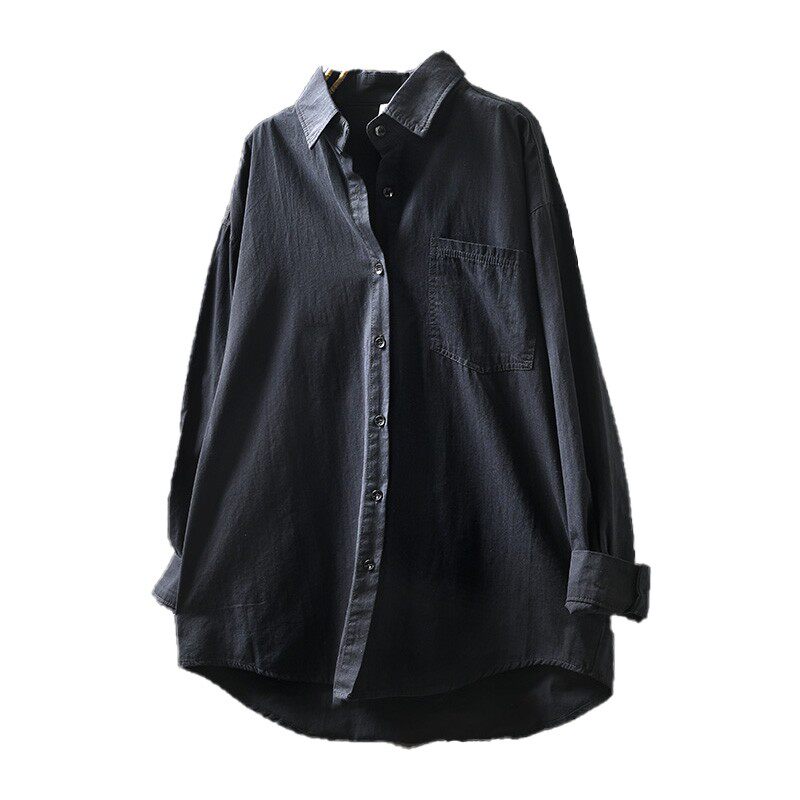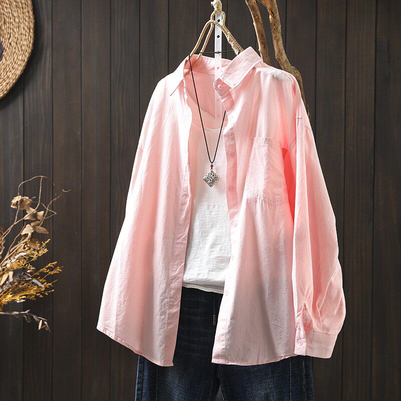 衬衫女款2026新款春装纯棉翻领复古大码百搭宽松长袖纯色衬衣上衣