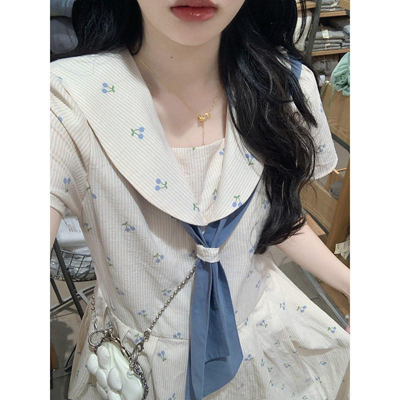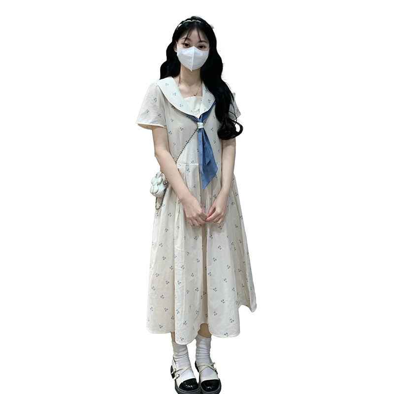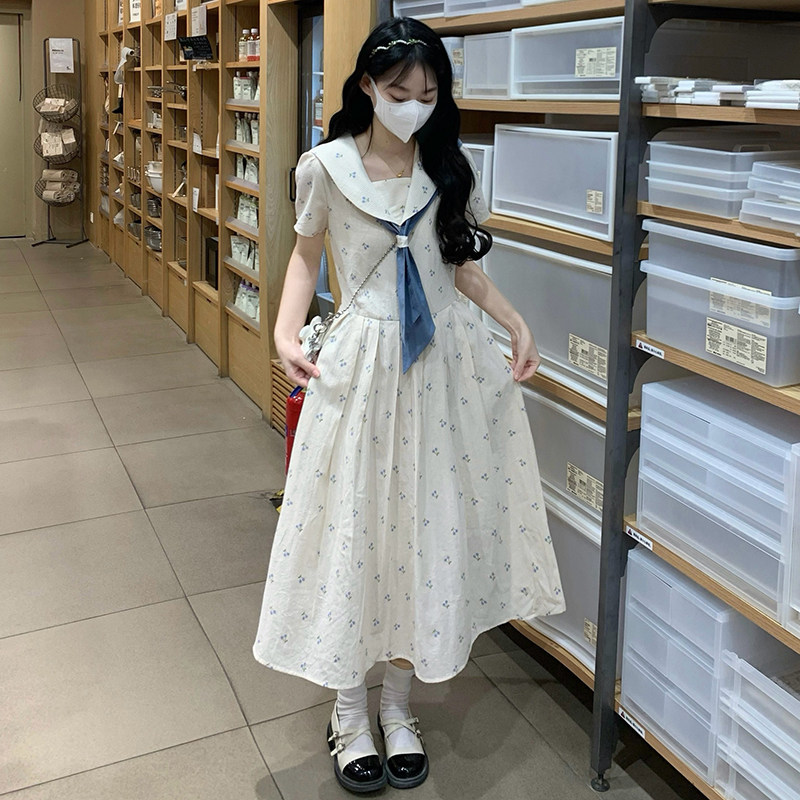 甜美海军领碎花连衣裙女大童夏季初中高中生小个子显瘦长裙少女风