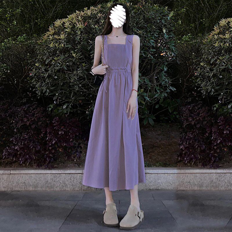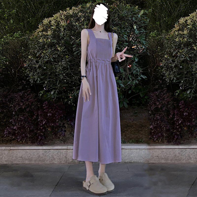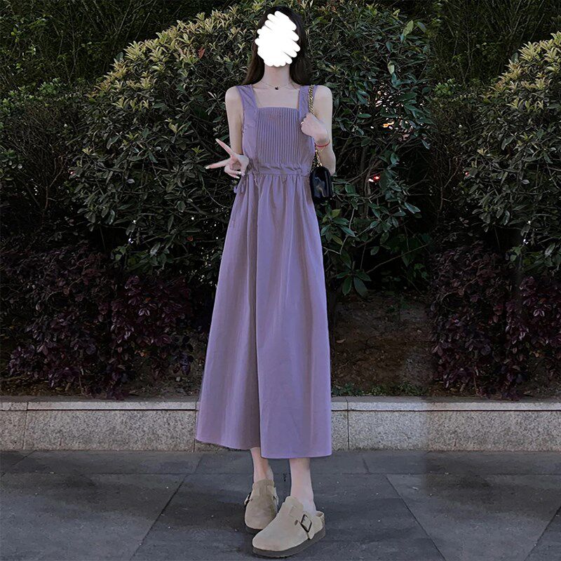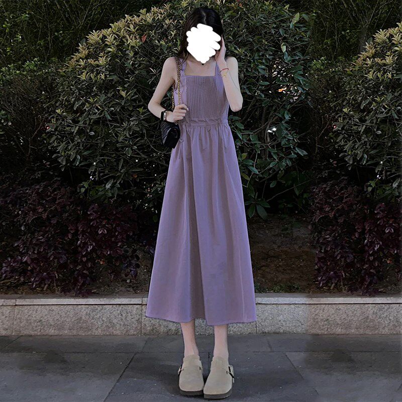 设计感韩版紫色吊带连衣裙女夏季小个子温柔收腰显瘦气质a字长裙