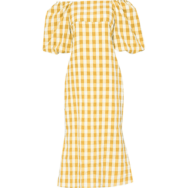 夏季女装2026新款减龄黄色格纹泡泡袖修身收腰显瘦连衣裙大码长裙