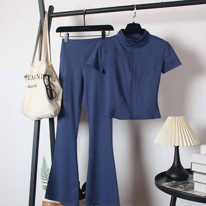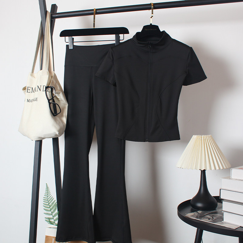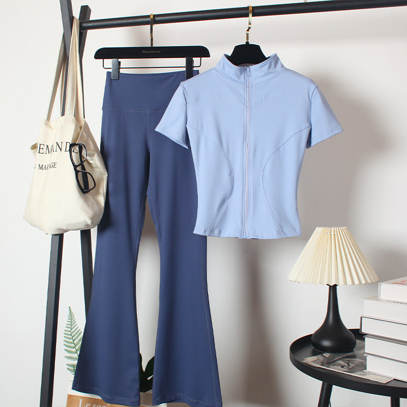 健身房运动套装女夏速干喇叭长裤跑步拉链瑜伽服修身显瘦立领短袖