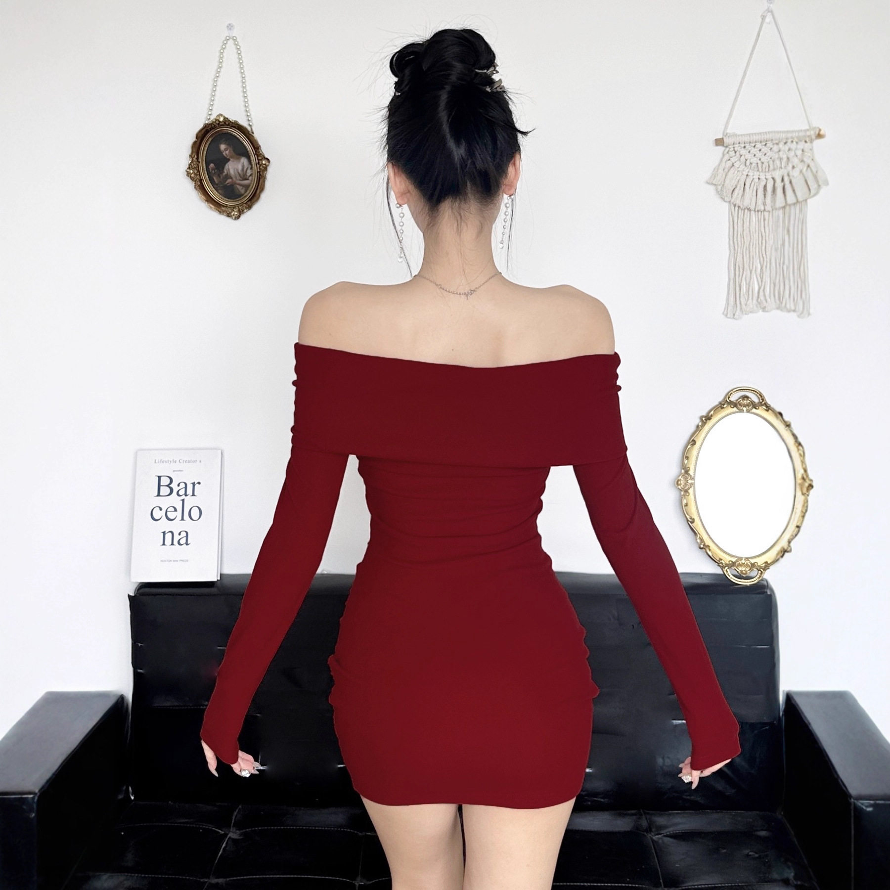 秋冬绝美一字肩红色连衣裙女长袖纯欲性感辣妹圣诞小个子包臀裙子