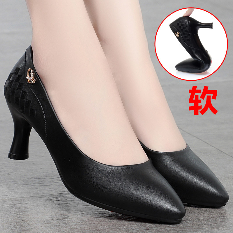 妈妈鞋软底春秋单鞋不累脚休闲中年高跟真皮百搭时尚中跟女士皮鞋