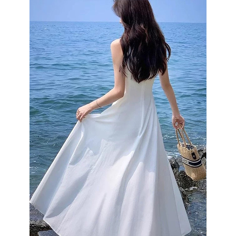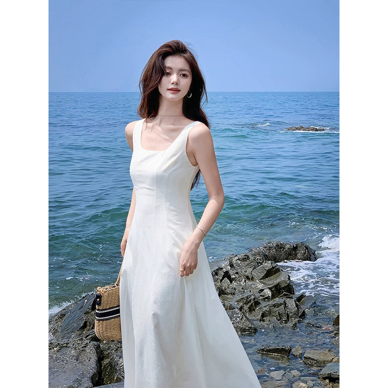 大码女装法式气质显瘦蓝色无袖连衣裙高级感海边度假绝美大摆裙
