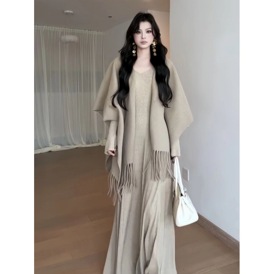 大码胖mm法式轻奢风斗篷披肩V领内搭收腰长袖针织连衣裙两件套装