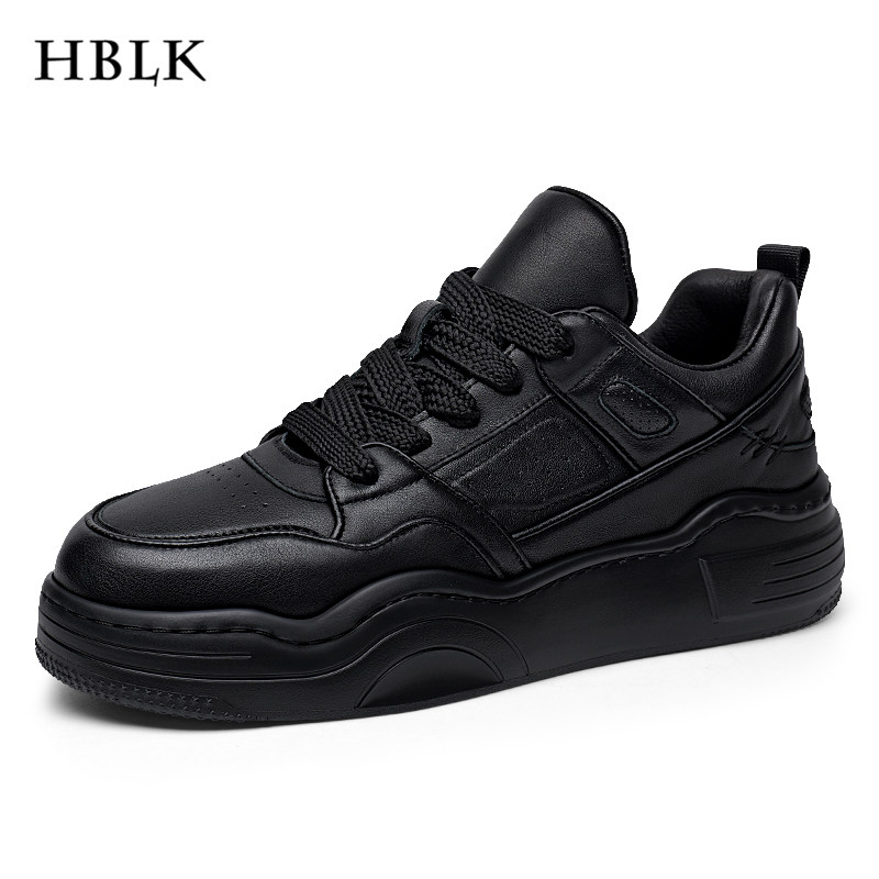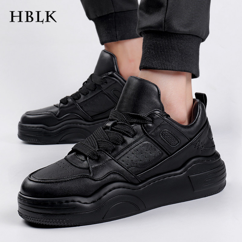 HBLK男鞋真皮春季厚底休闲鞋子头层牛皮男士百搭黑色增高运动板鞋