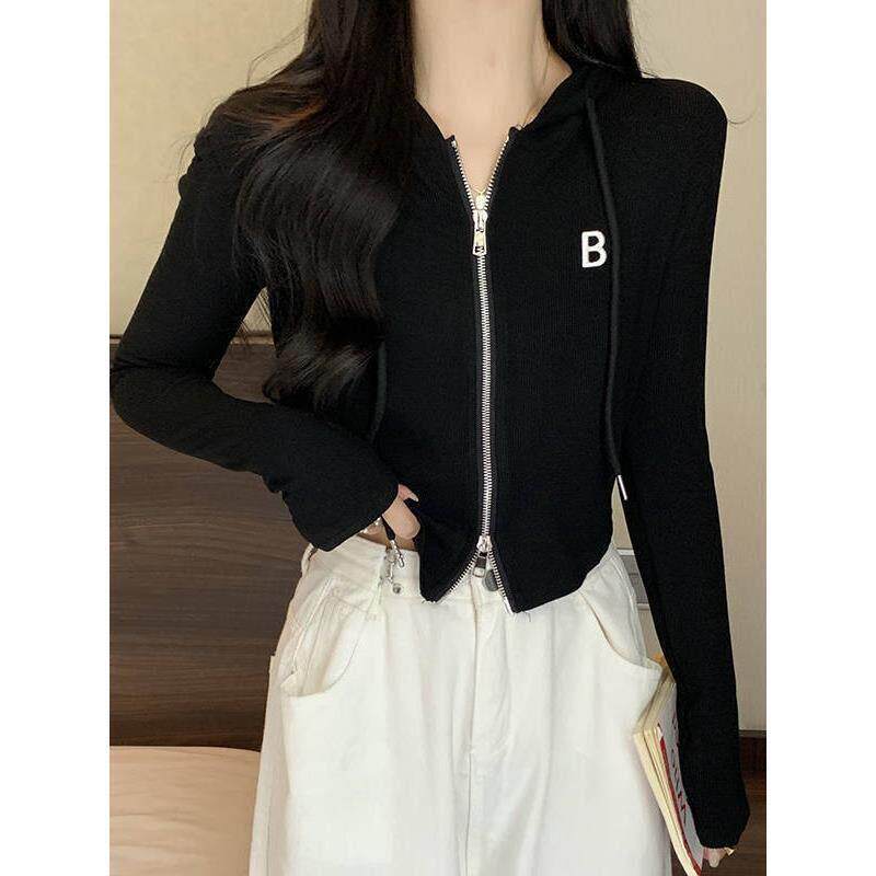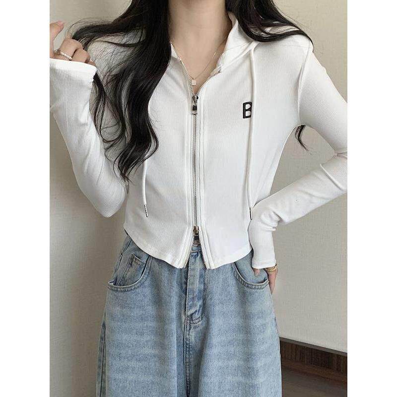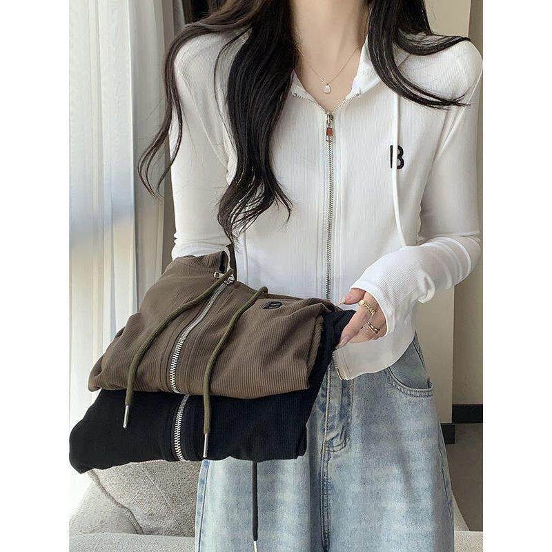 女款春季打底t恤帽衫新款2026双拉炼连帽外套长袖薄款修身0323z1