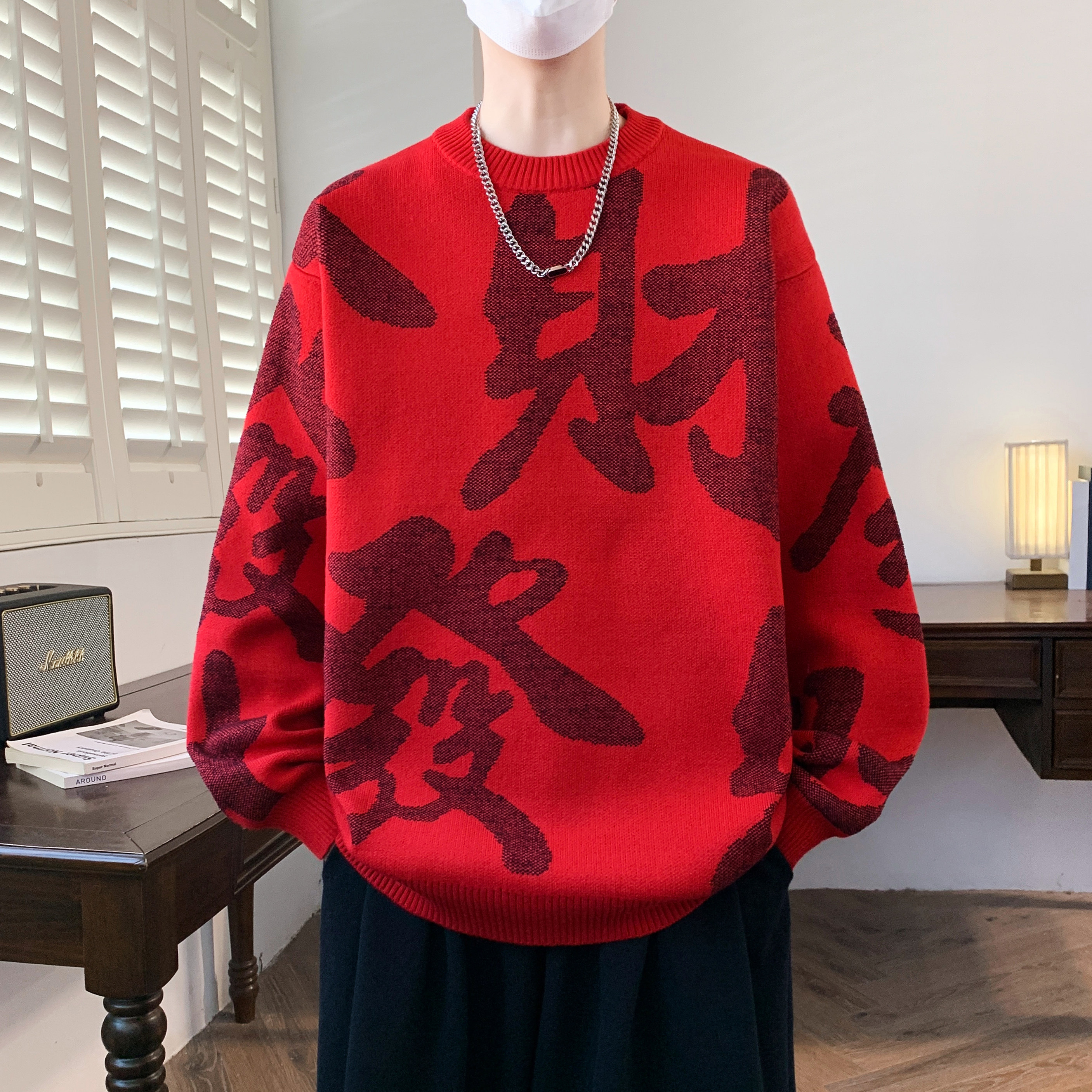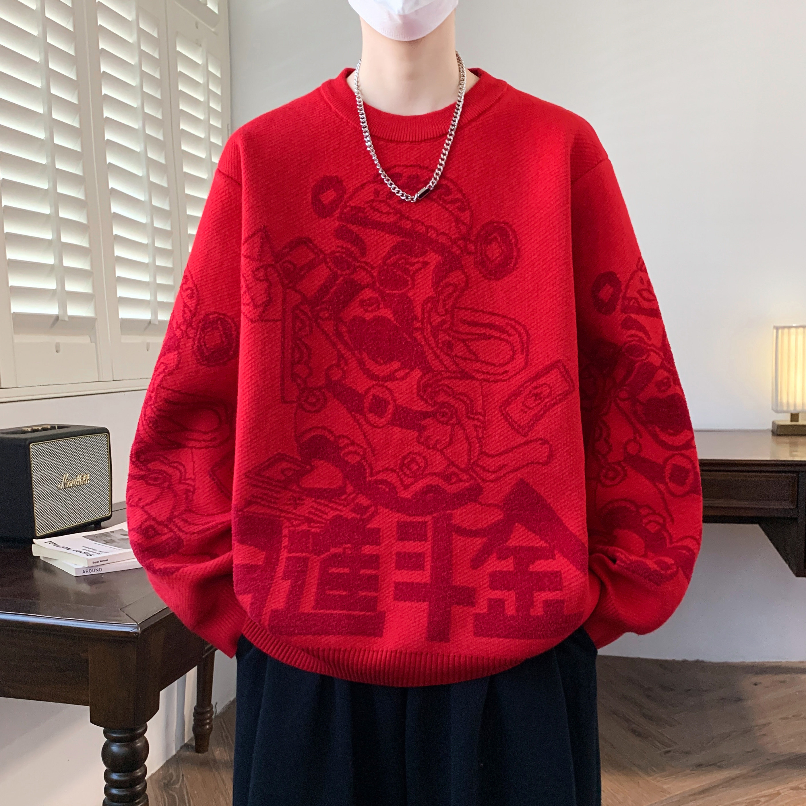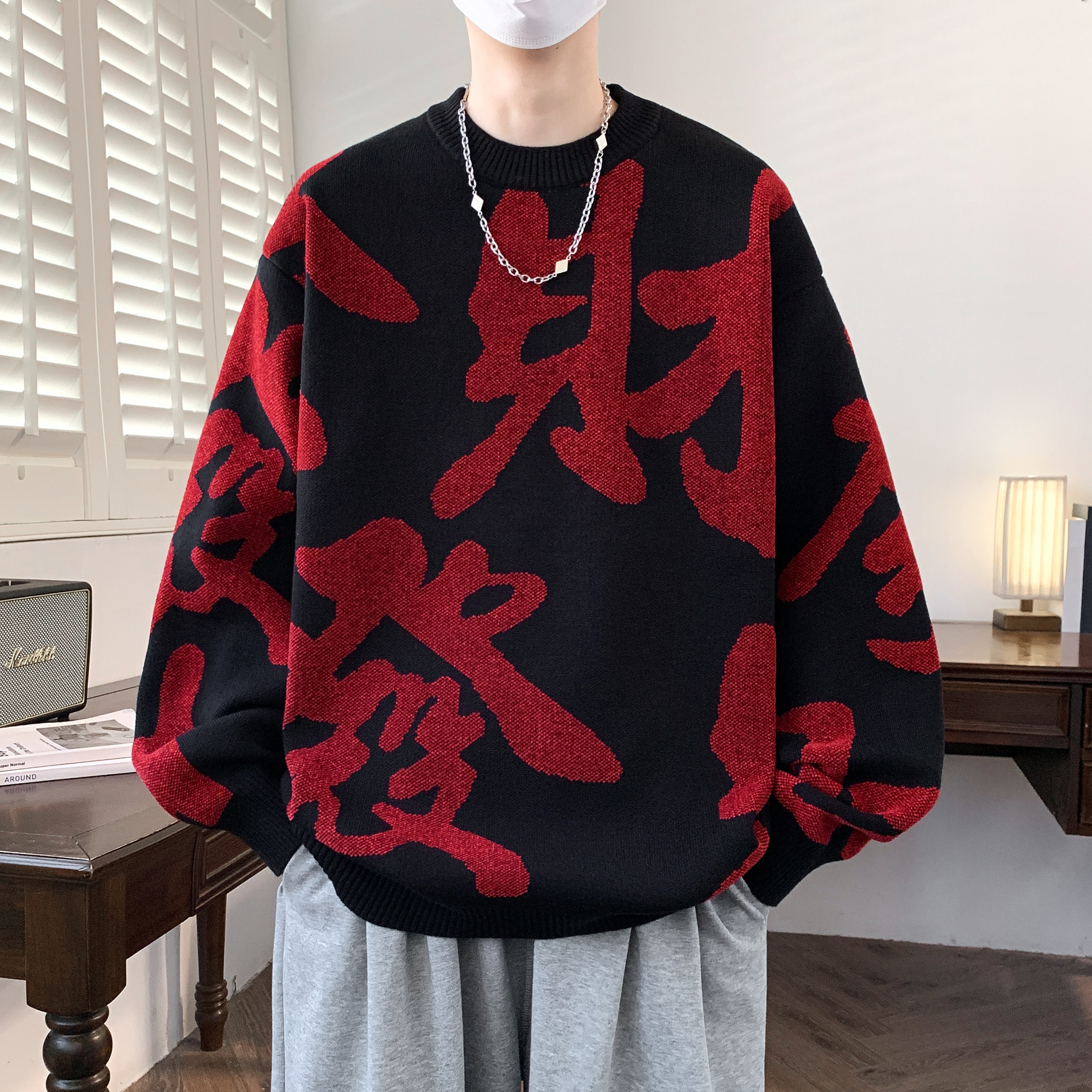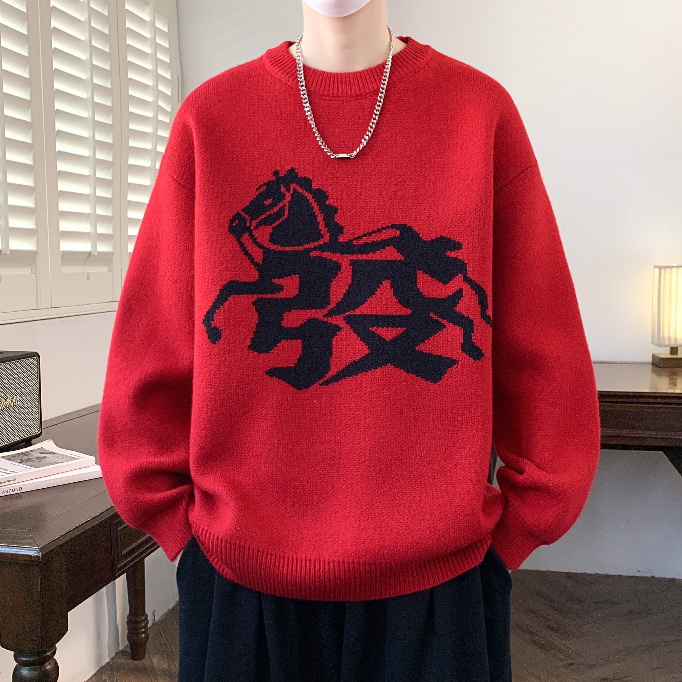 本命年红色毛衣男款冬季马年发财宽松针织衫新年拜年服内搭打底衫