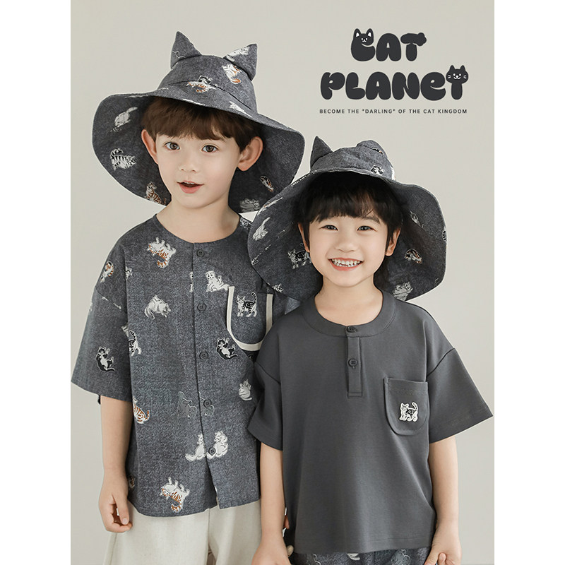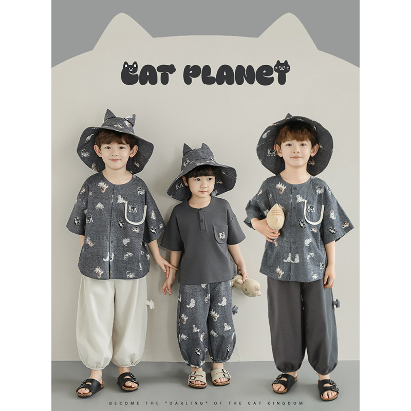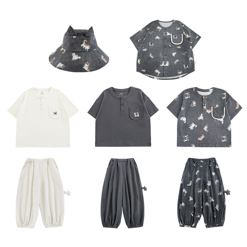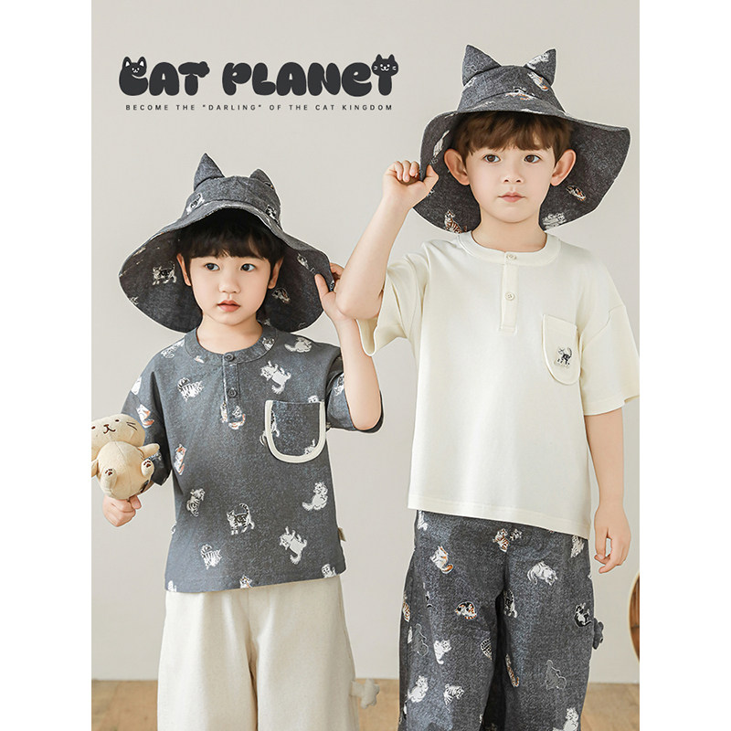 幼悠 男童套装2026夏季新款猫咪短袖衬衫圆领T恤宽松百搭防蚊裤潮