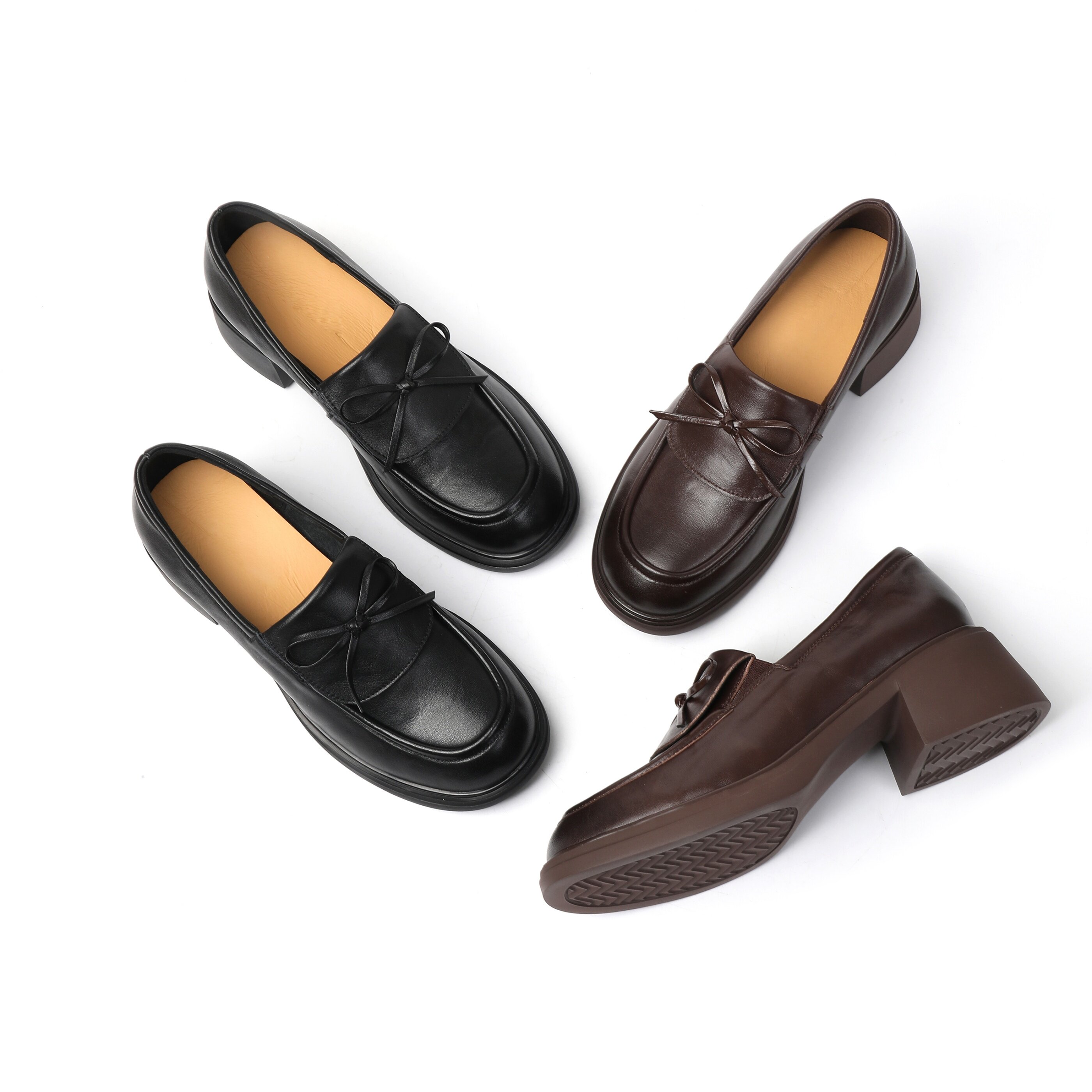 头层牛皮英伦风真皮乐福鞋女黑色蝴蝶结粗跟一脚蹬通勤单鞋学院风