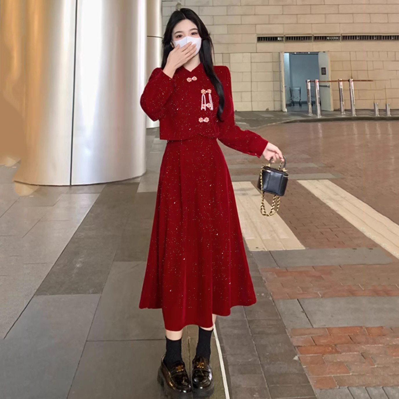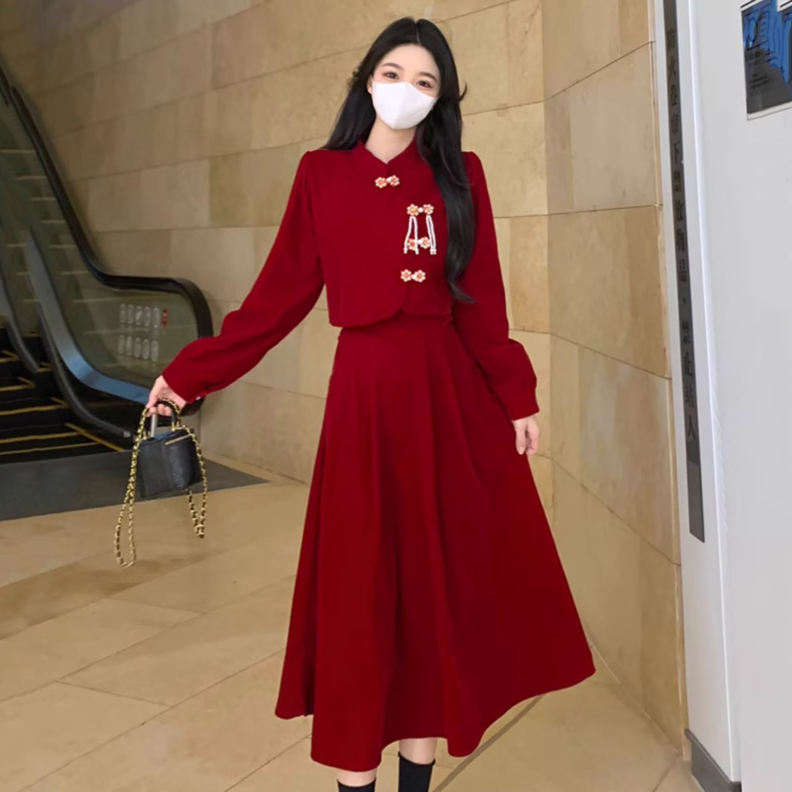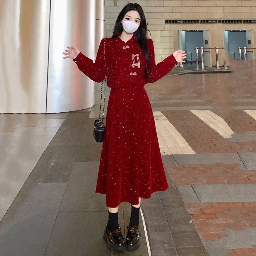 胖mm大码红色长袖连衣裙女订婚礼服新娘敬酒服平时可穿假两件裙子
