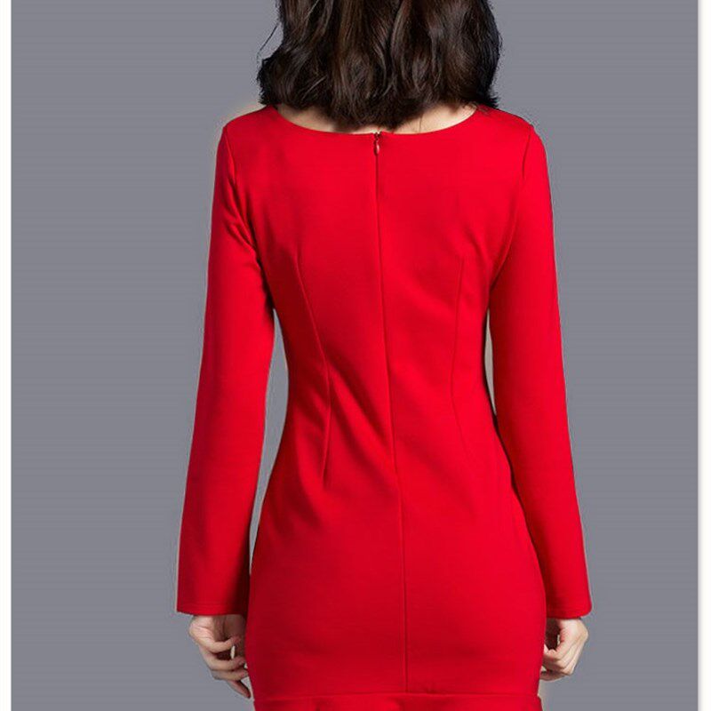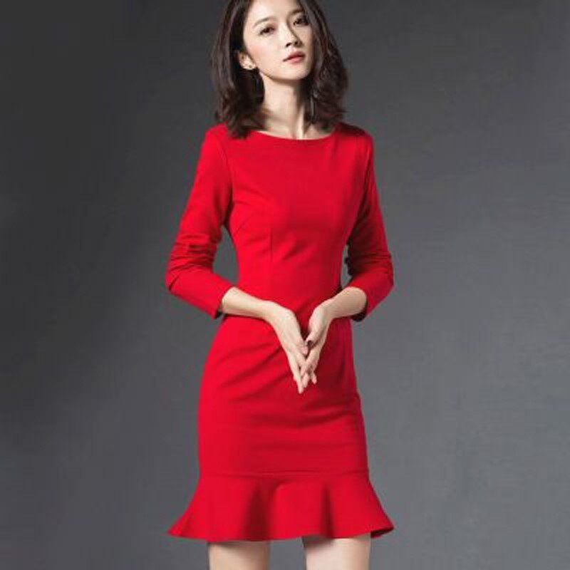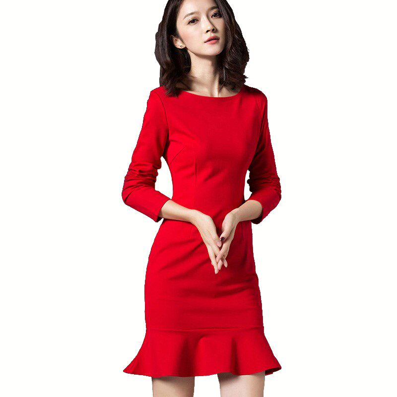 23春季连衣裙女长袖包臀鱼尾裙修身显瘦红色礼服小黑裙大码打底裙