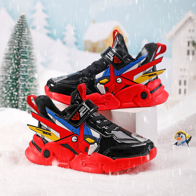 本命年红色男童机甲轻跑步鞋秋冬儿童防水皮面运动鞋加绒男孩鞋子