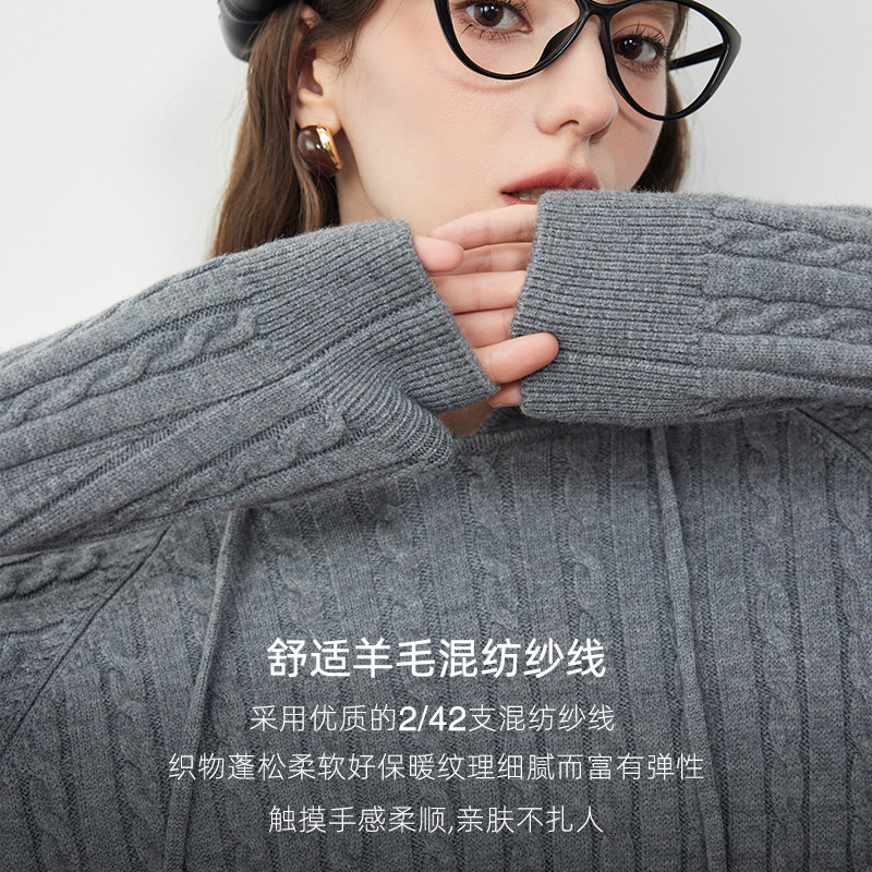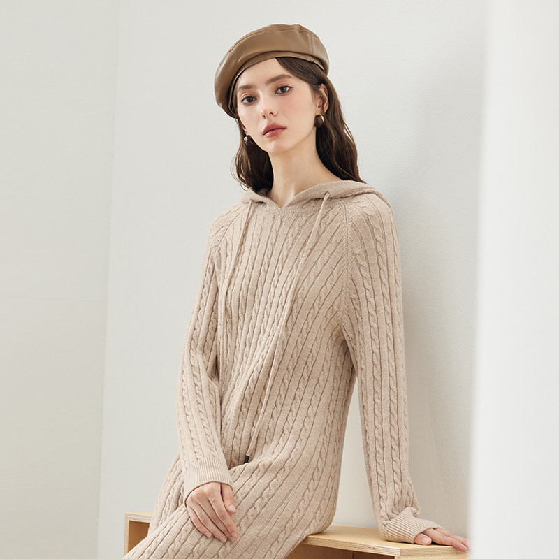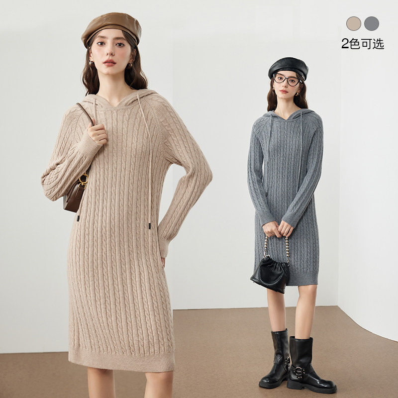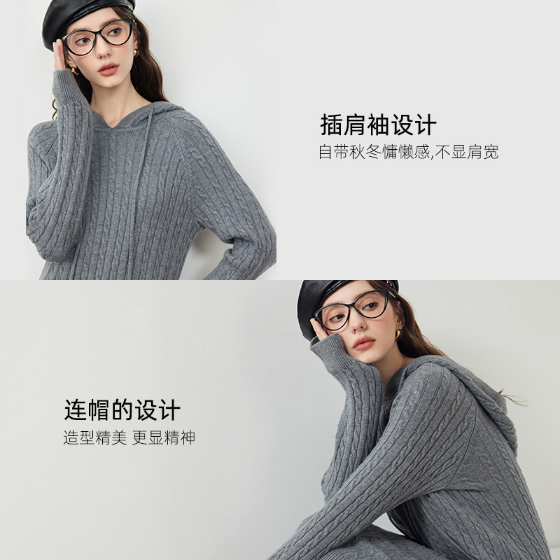 灰色长袖针织连衣裙女修身中长款kbne气质秋冬新款显瘦连帽毛衣裙