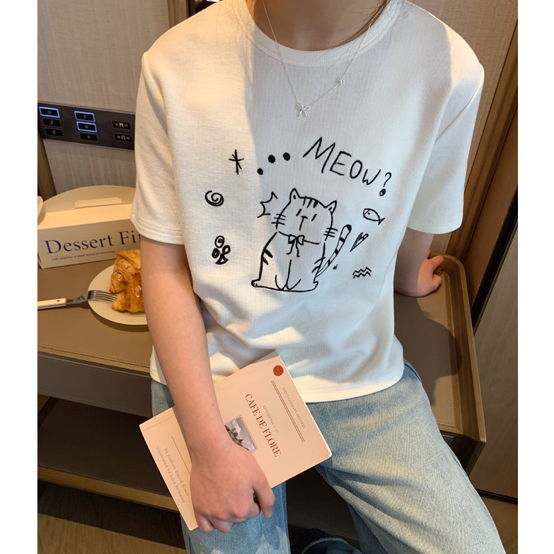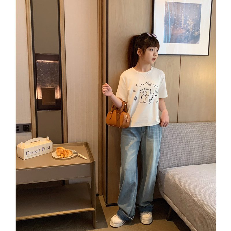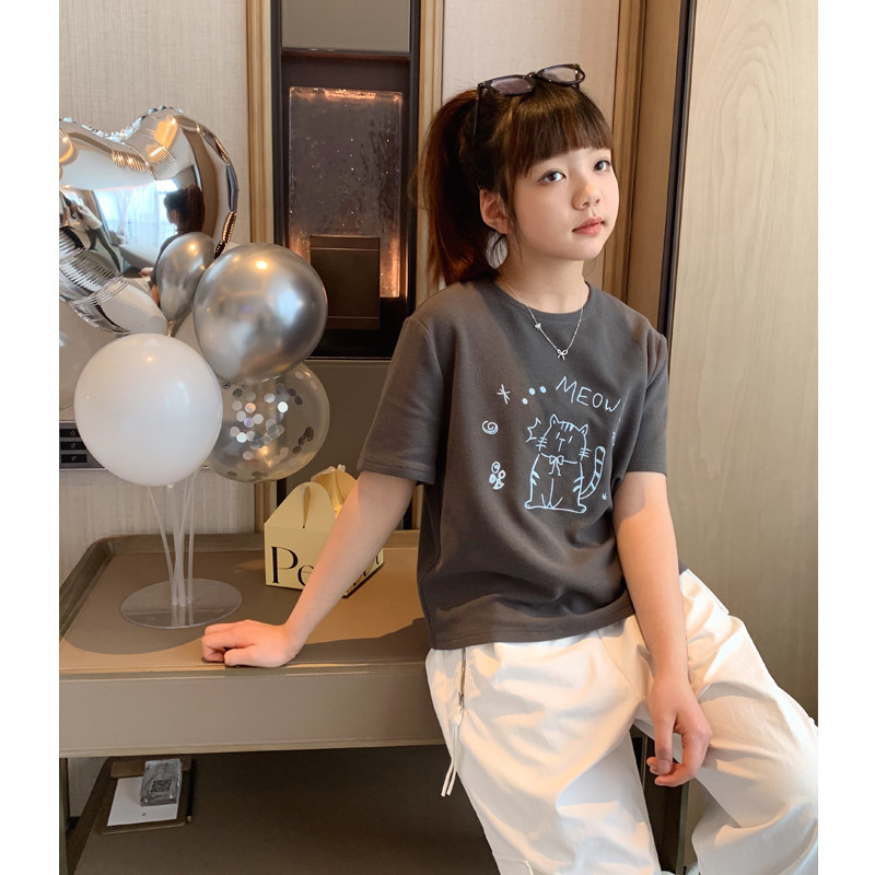 女大童猫咪刺绣宽松短袖2025春夏季新款初中生显瘦短款韩版棉T恤