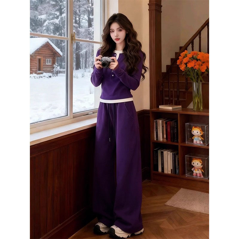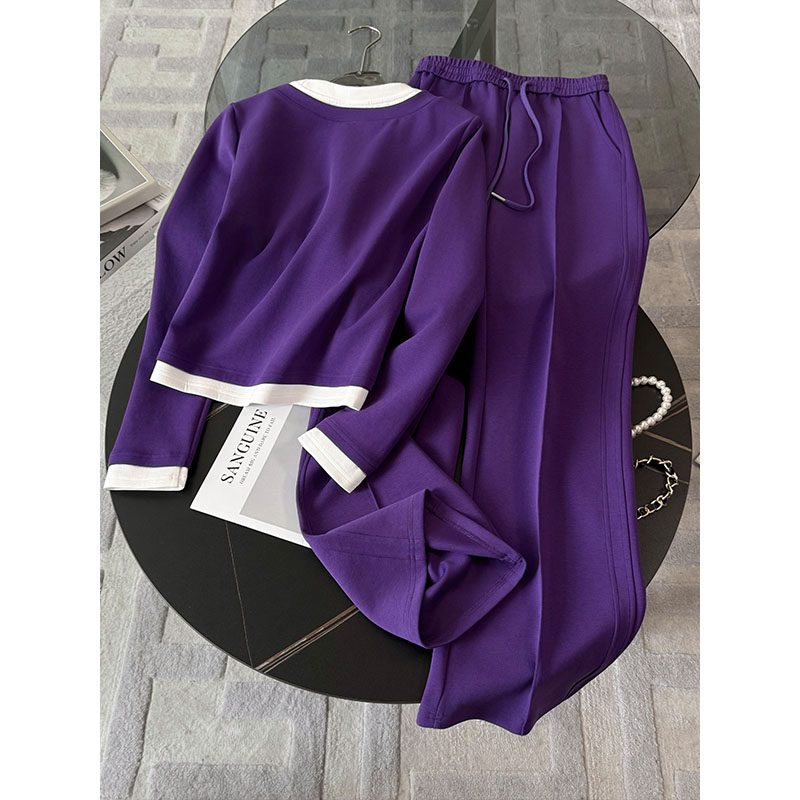 韩系紫色连帽假两件卫衣阔腿裤两件套女2026春款运动休闲套装