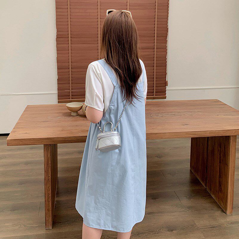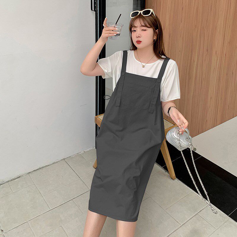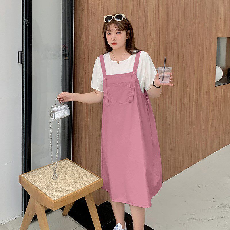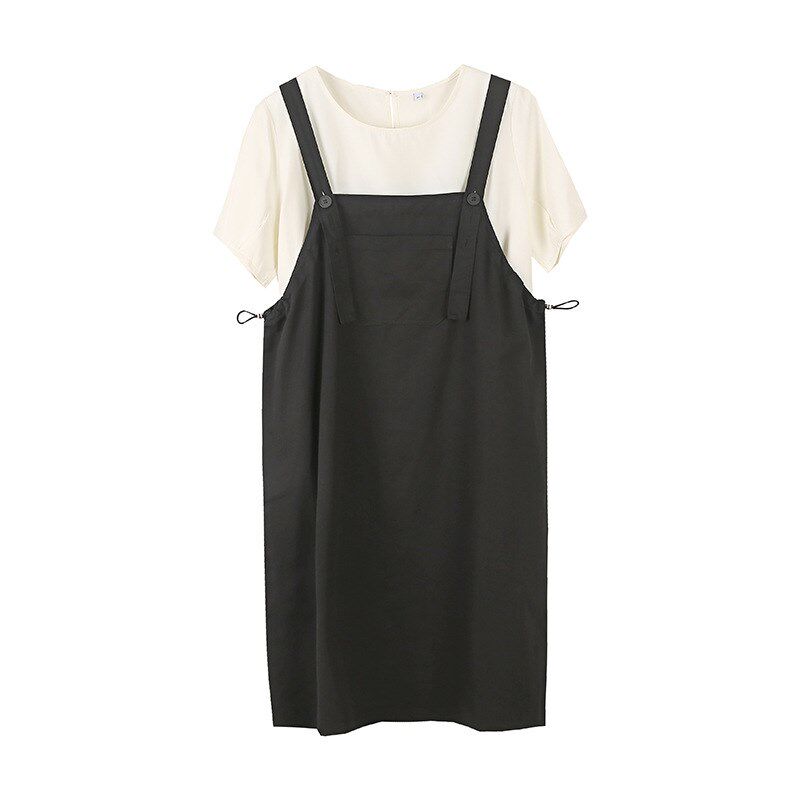 大码女装200斤胖mm夏季学院风宽松显瘦中长款背带连衣裙两件套装