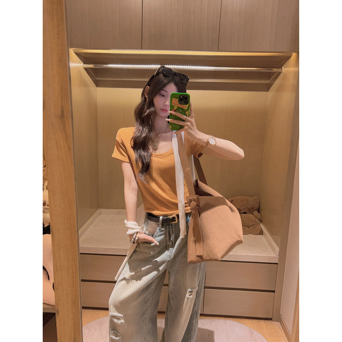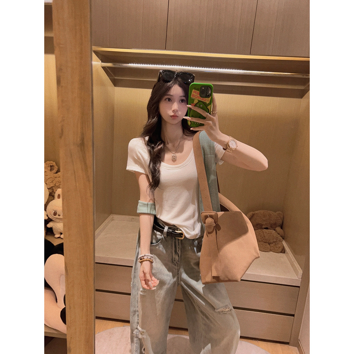 Yukiss 正肩U领复古短袖T恤女夏韩系修身显瘦百搭休闲打底衫上衣