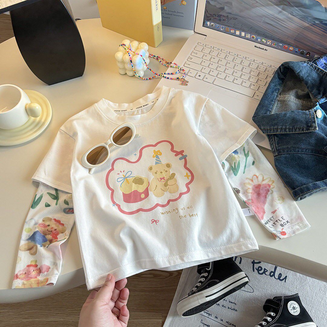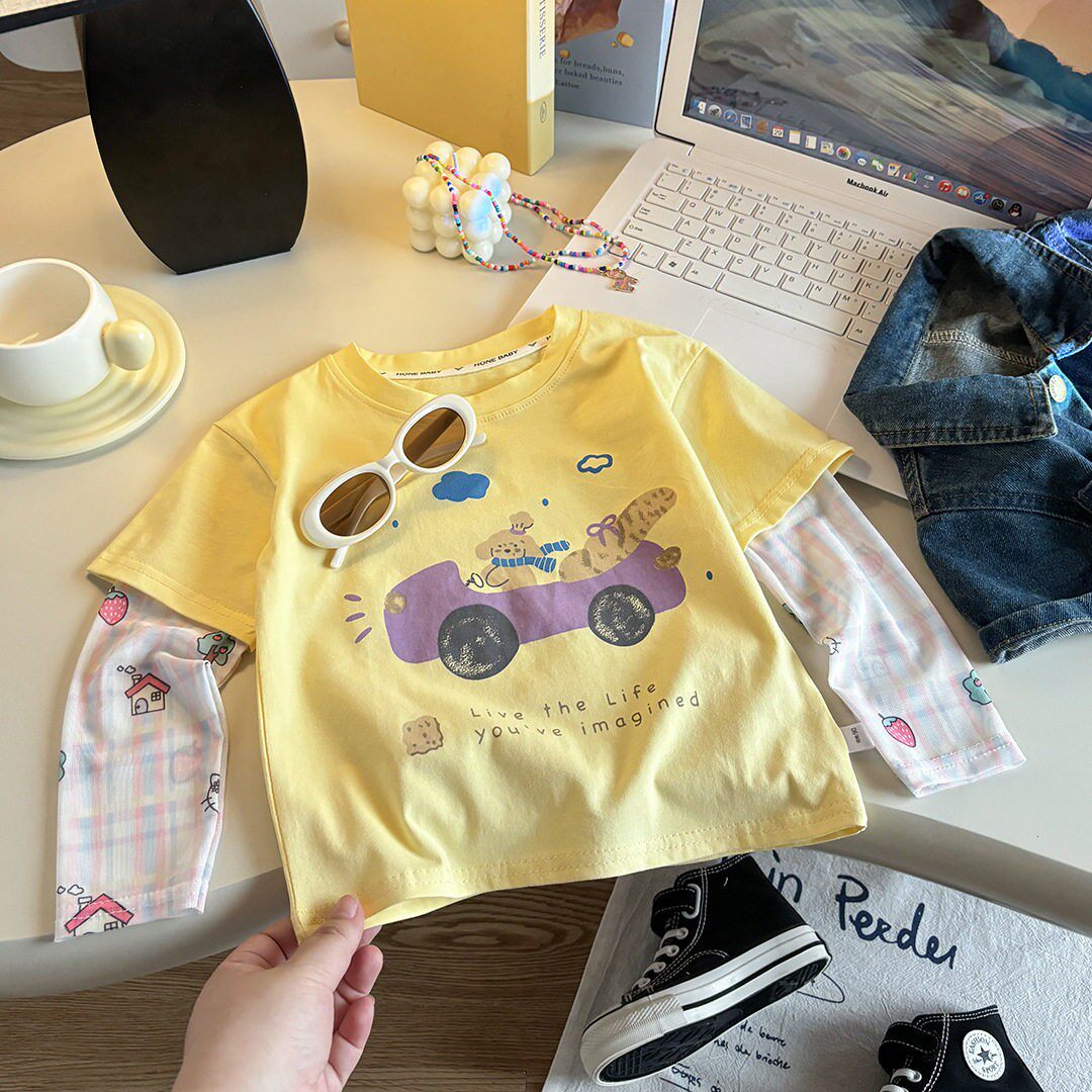 儿童T恤休闲卡通夏季2026新款夏天防晒袖假两件女童短袖上衣童装