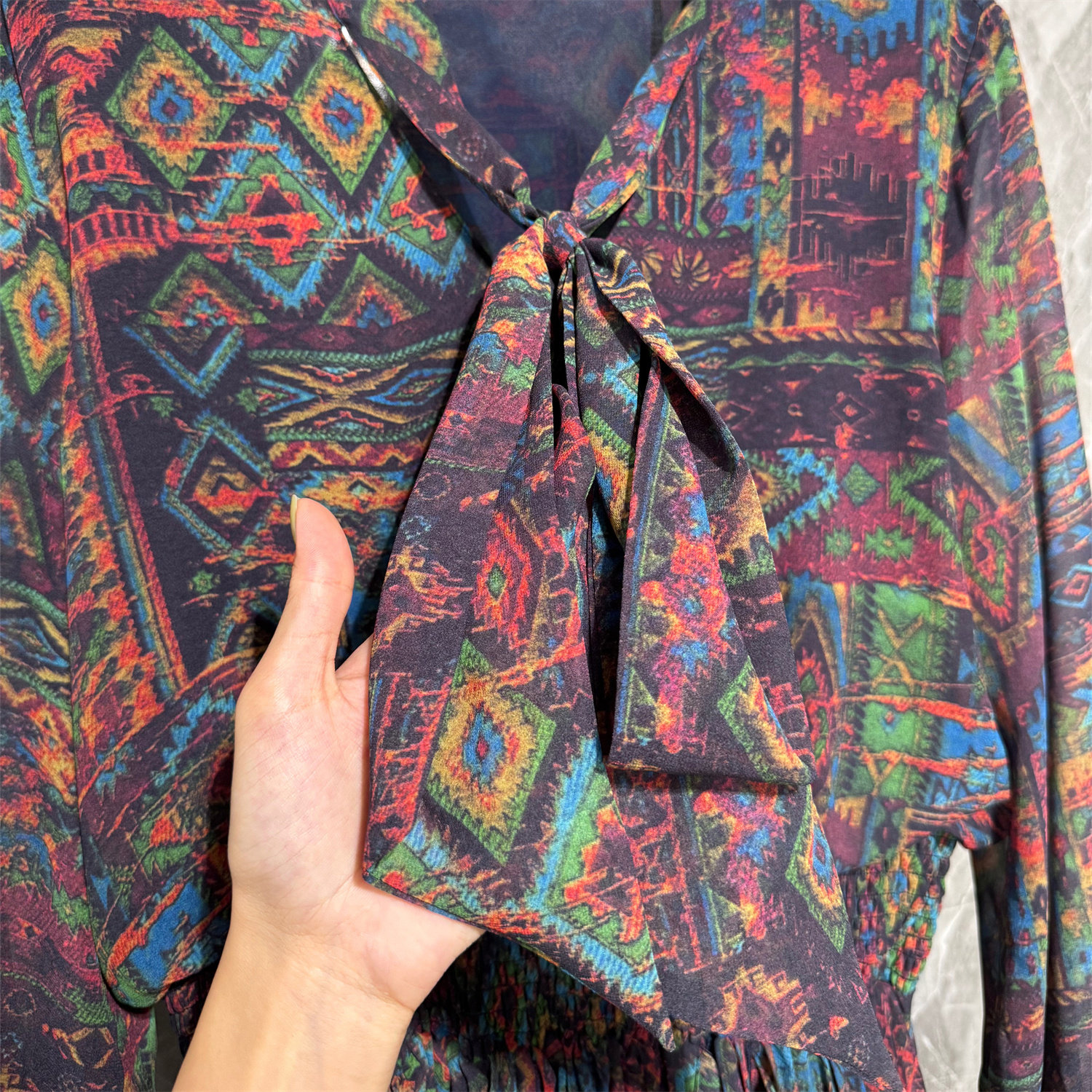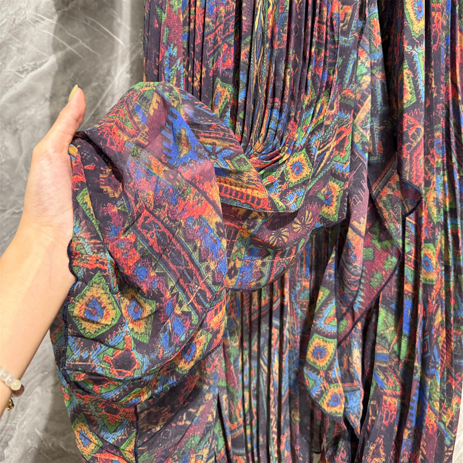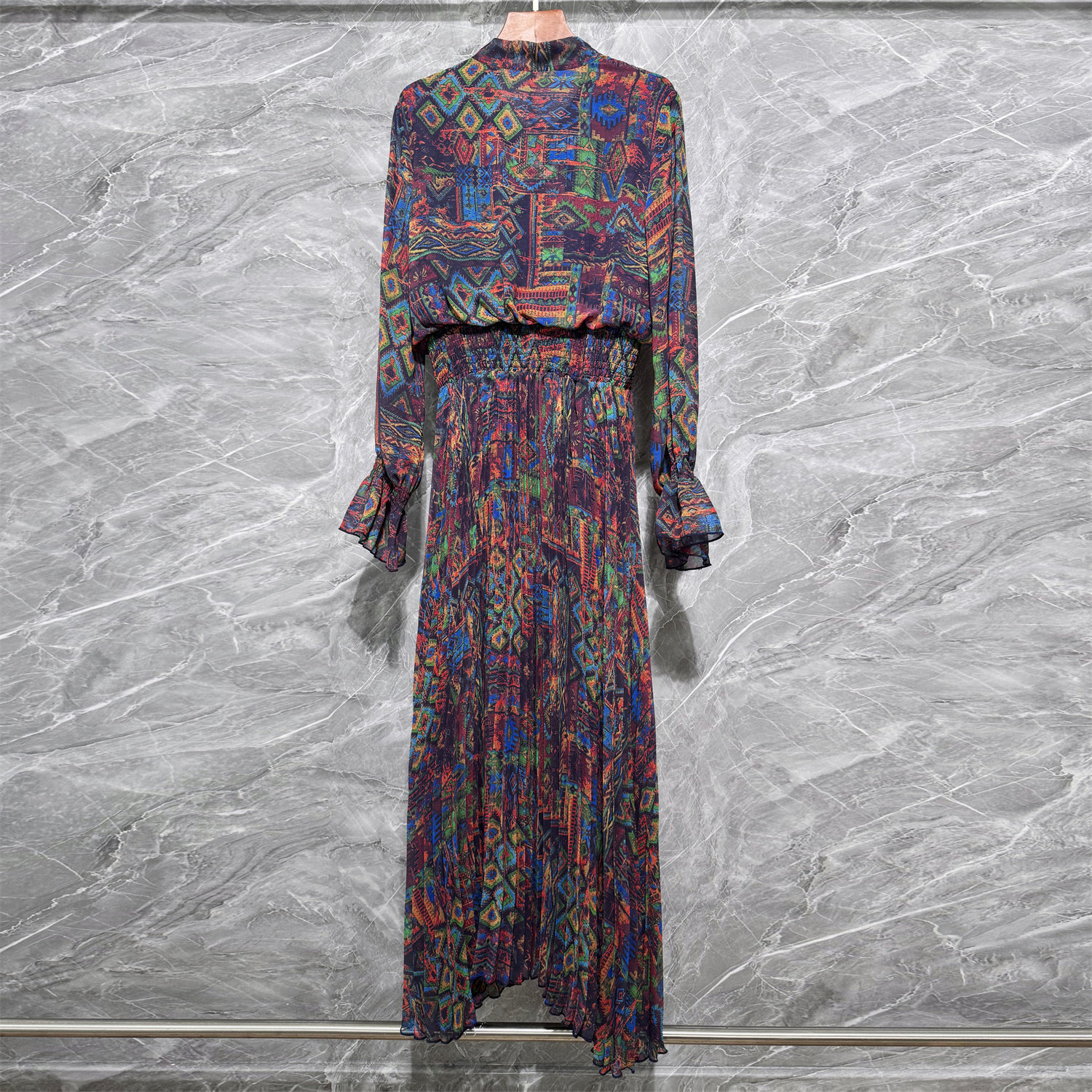 2026春夏新款欧美高端走秀款印花百褶连衣裙宴会长袖礼服裙中长款