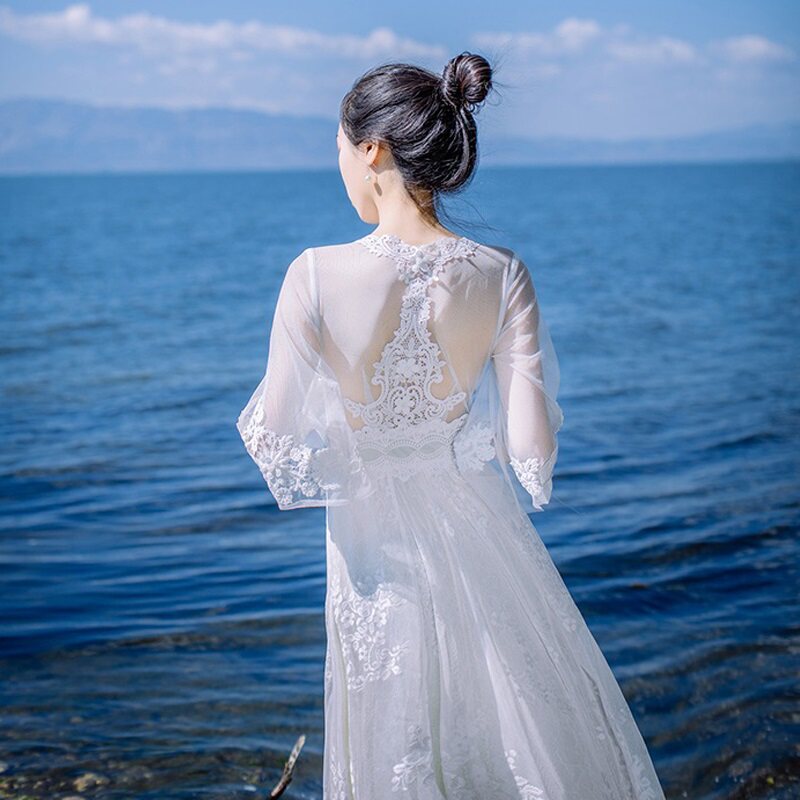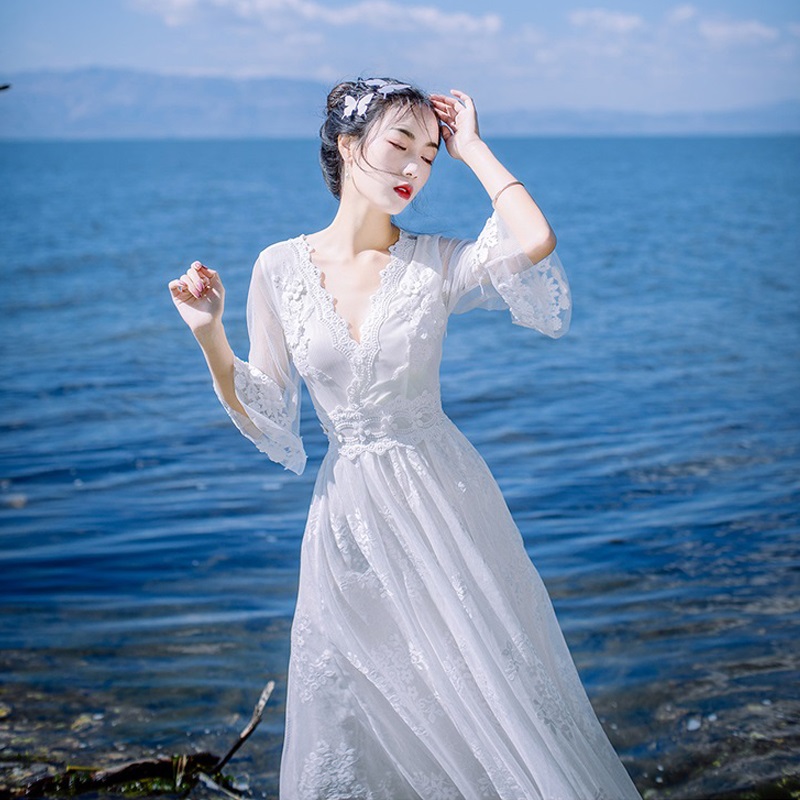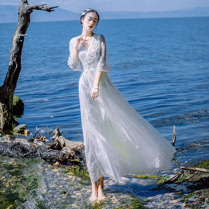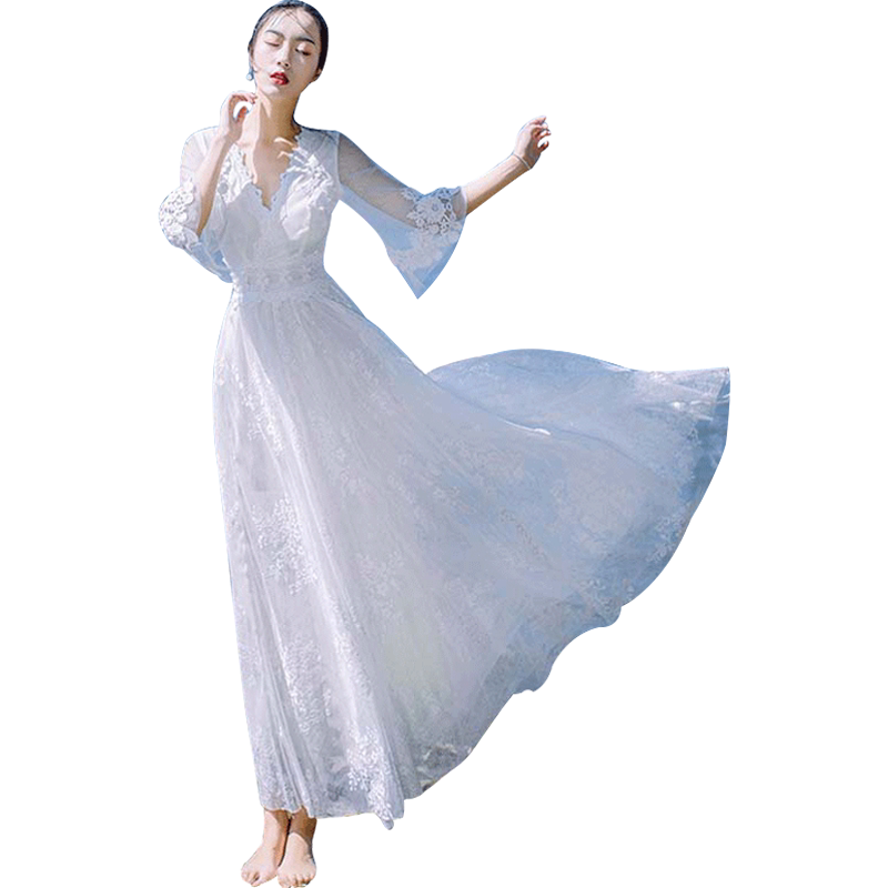 白色网纱裙子性感收腰高级旅途仙气礼服裙长裙海边度假连衣裙女夏
