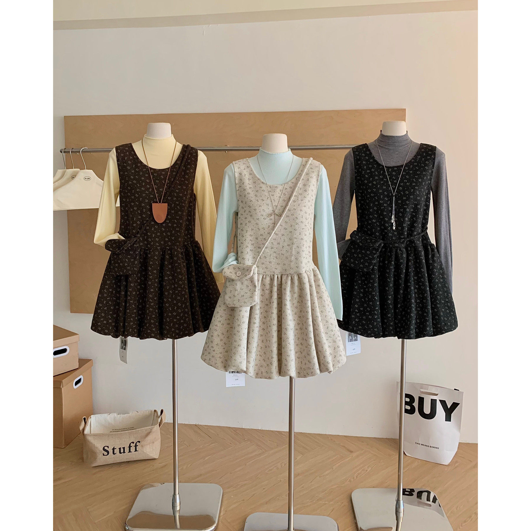 韩系甜美碎花背心花苞短裙女秋冬叠穿宽松显瘦打底衫减龄三件套装