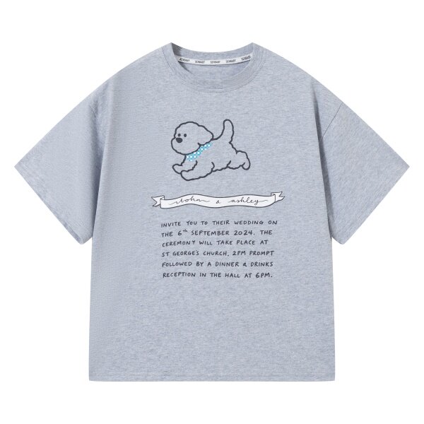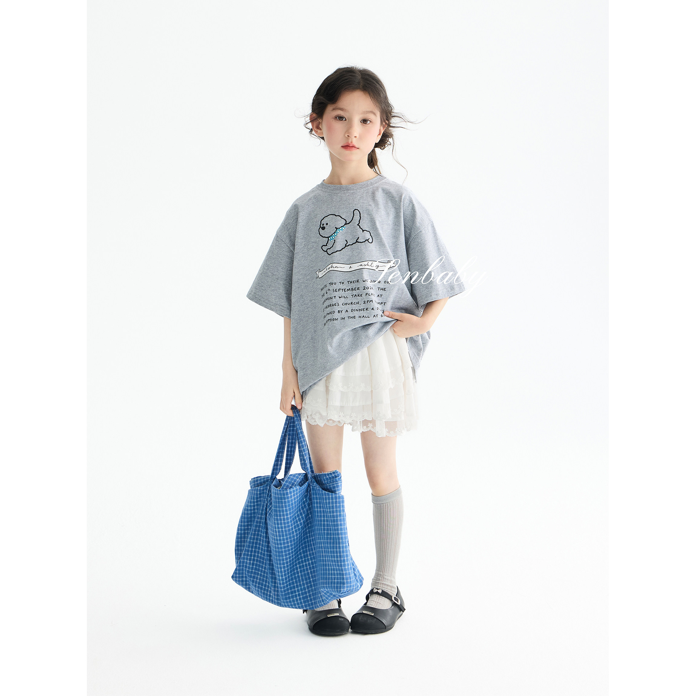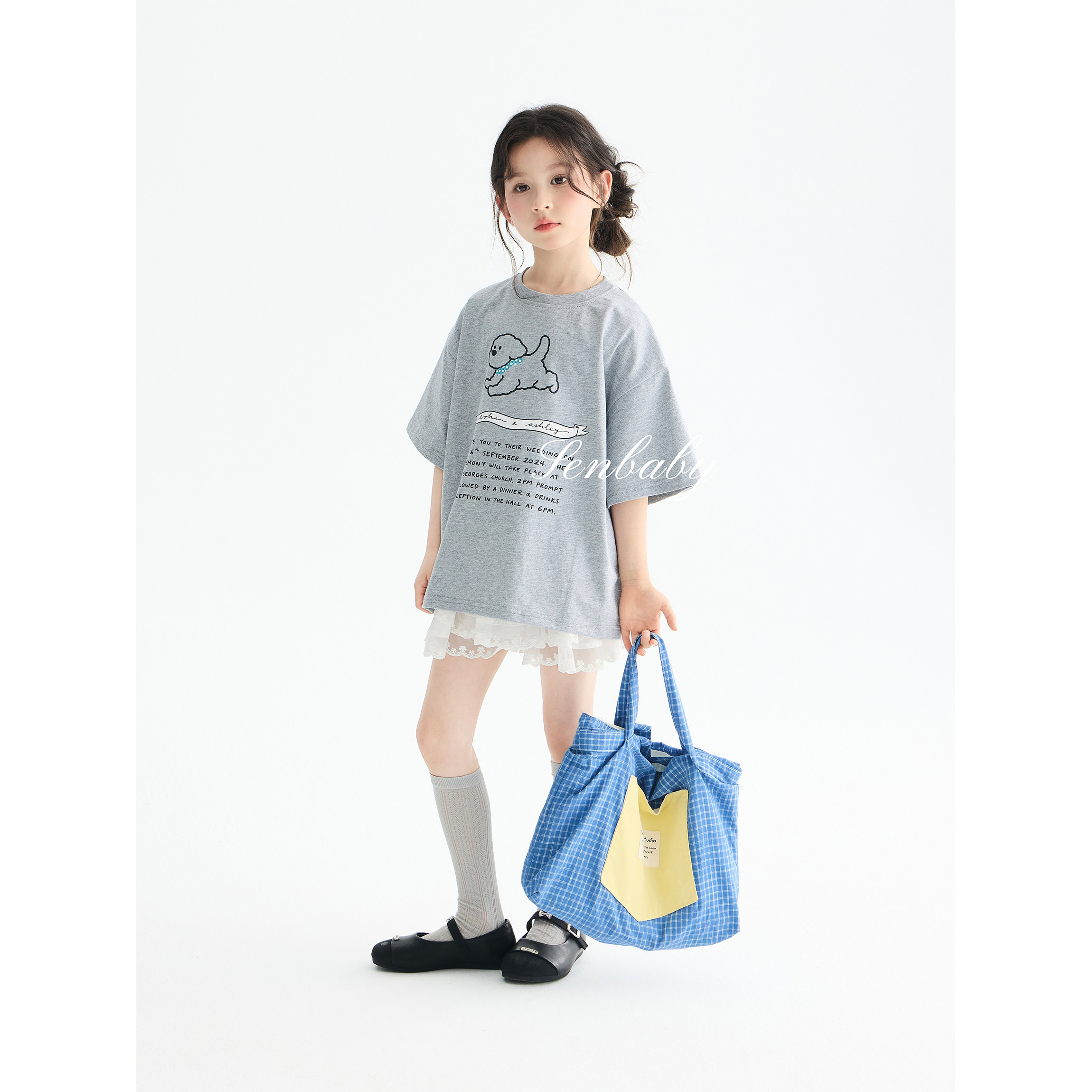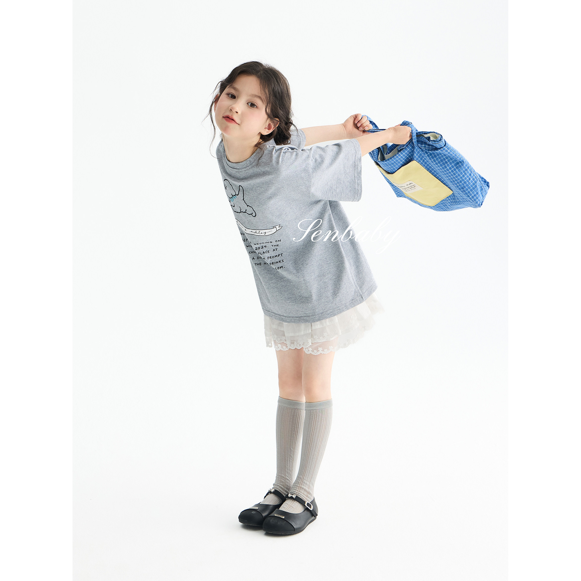 senbaby童装女童夏季短袖裙裤套装儿童灰色小狗印花T恤蕾丝短裙裤