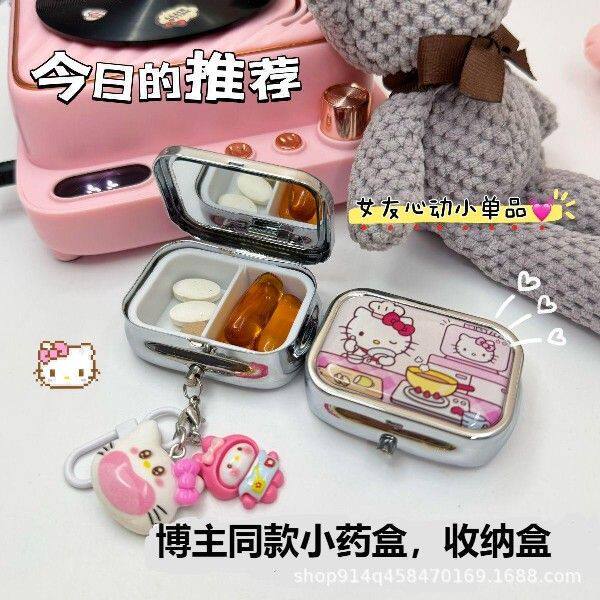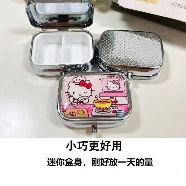可爱kitty迷你便携式随身小药盒药丸盒内两格金属盒首饰盒带镜片