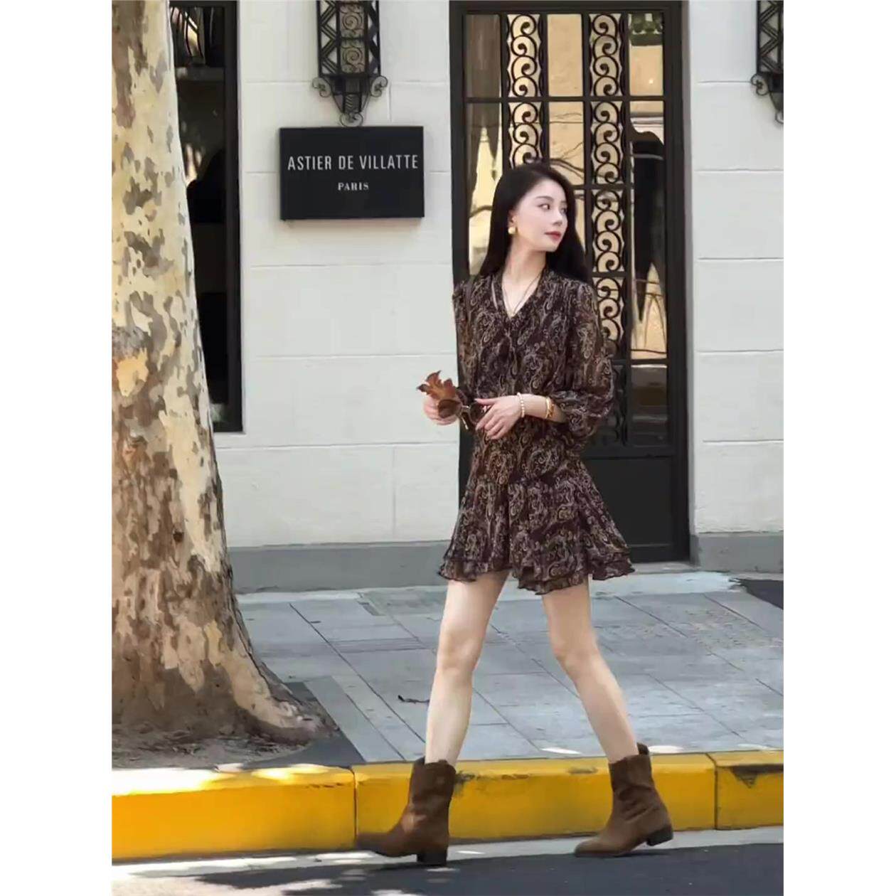 茶歇法式覆古碎花连衣裙女2025早秋新款独特气质设计感长袖短裙子