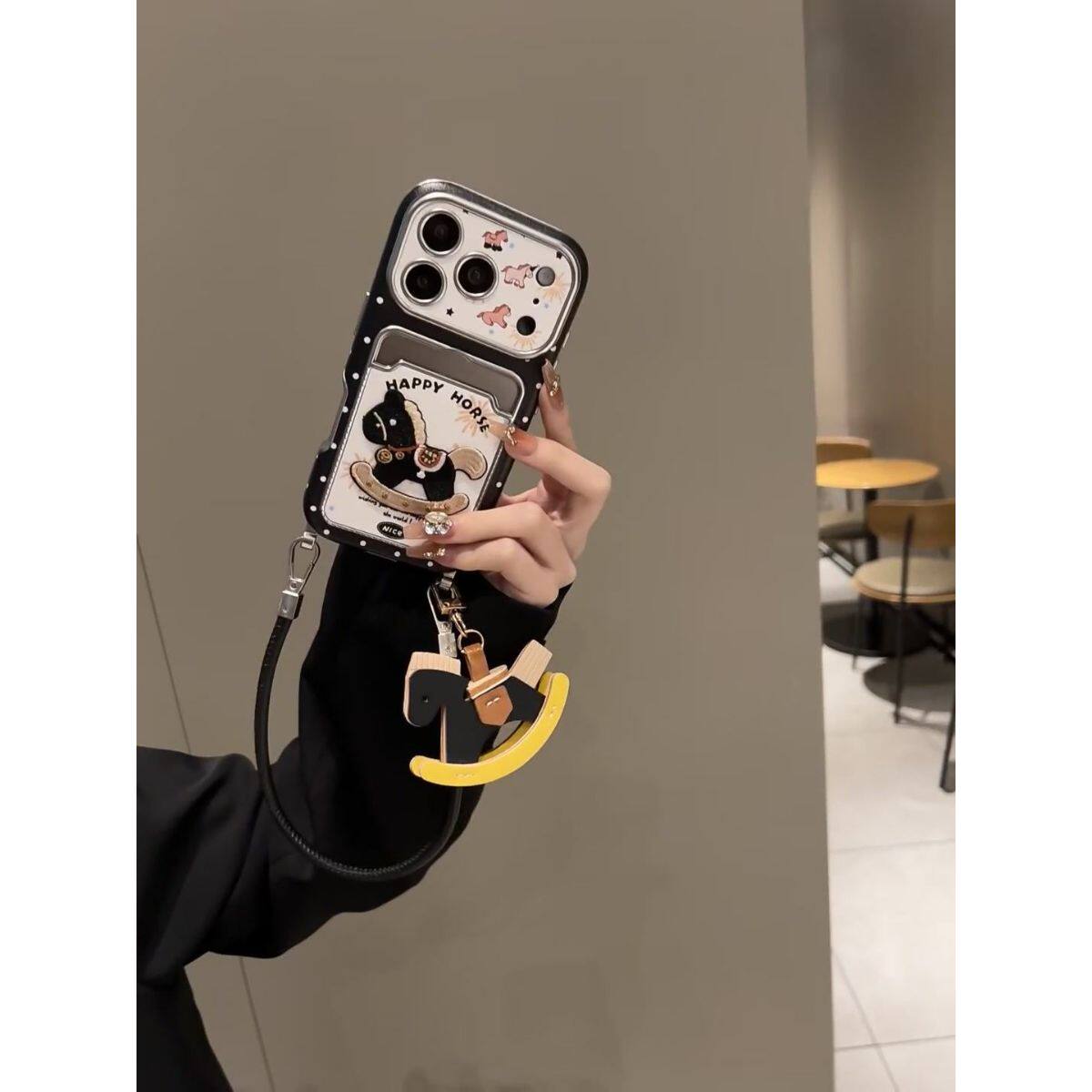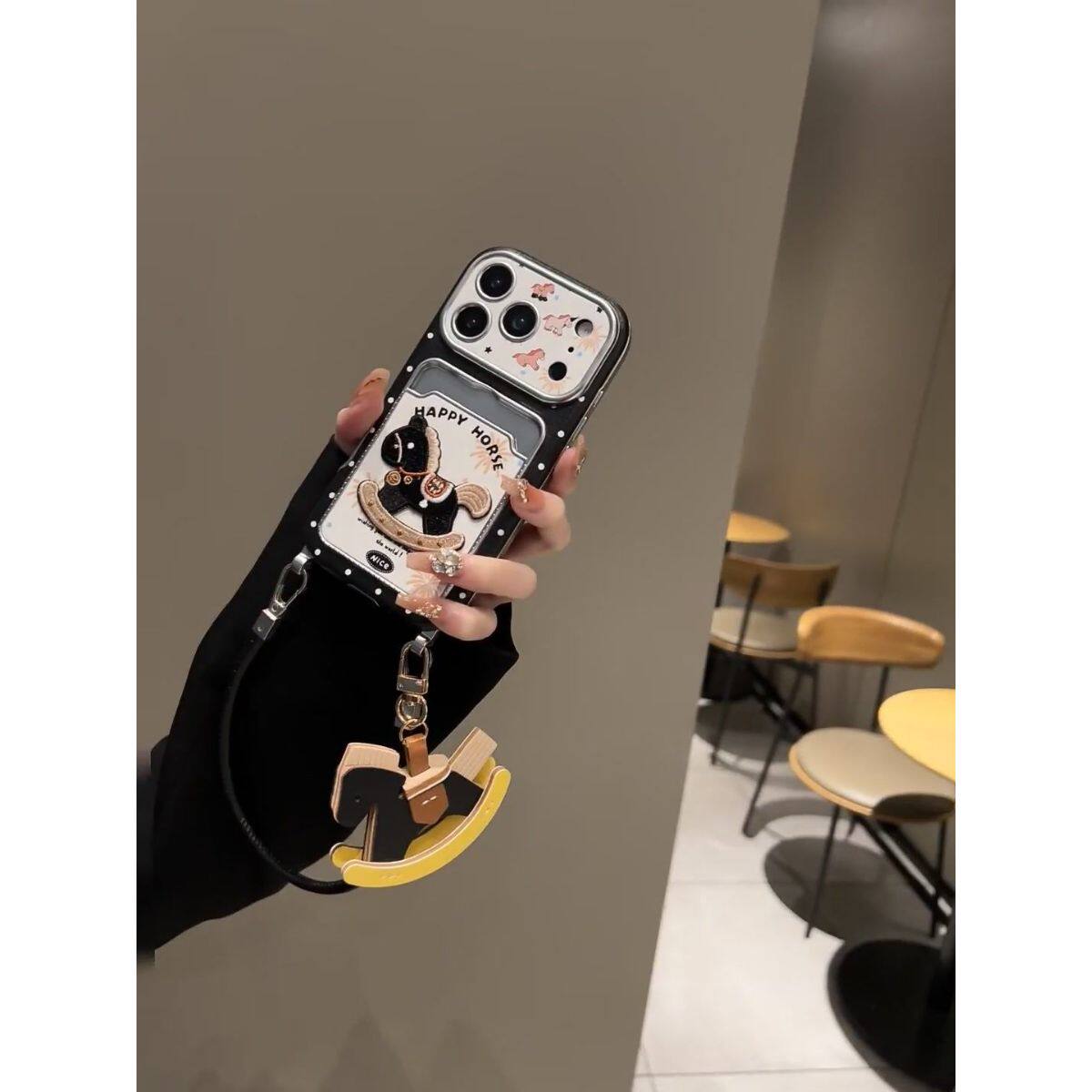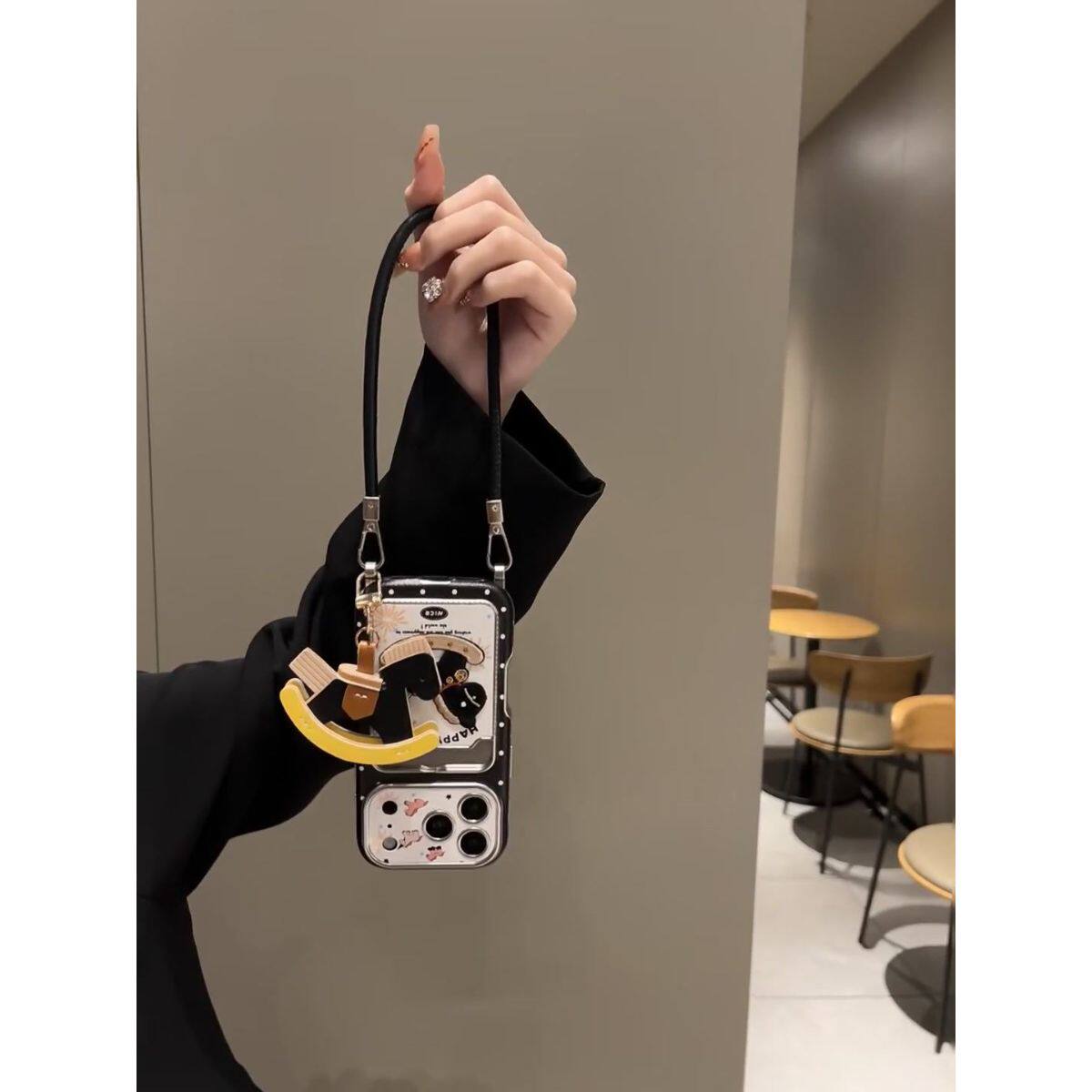 半糖壳野ins黑色波点摇摇马卡包适用iPhone17promax手机壳苹果16pro腕带15防摔14pro新款13防摔17保护套