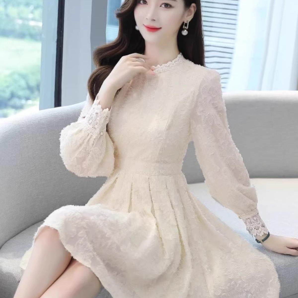蕾丝连衣裙子女装春秋冬2026年新款加绒加厚打底小个子长袖中长裙