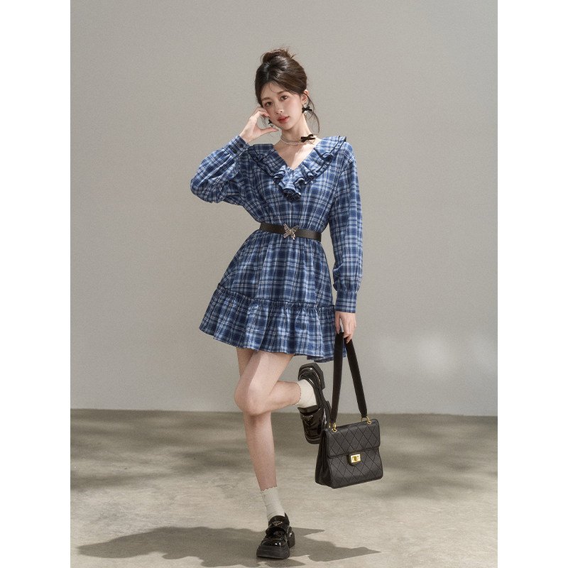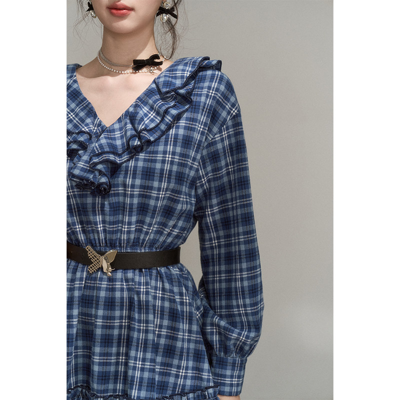 荷叶边v领蓝色格子长袖v领连衣裙秋季学院风韩系甜美设计感法式裙