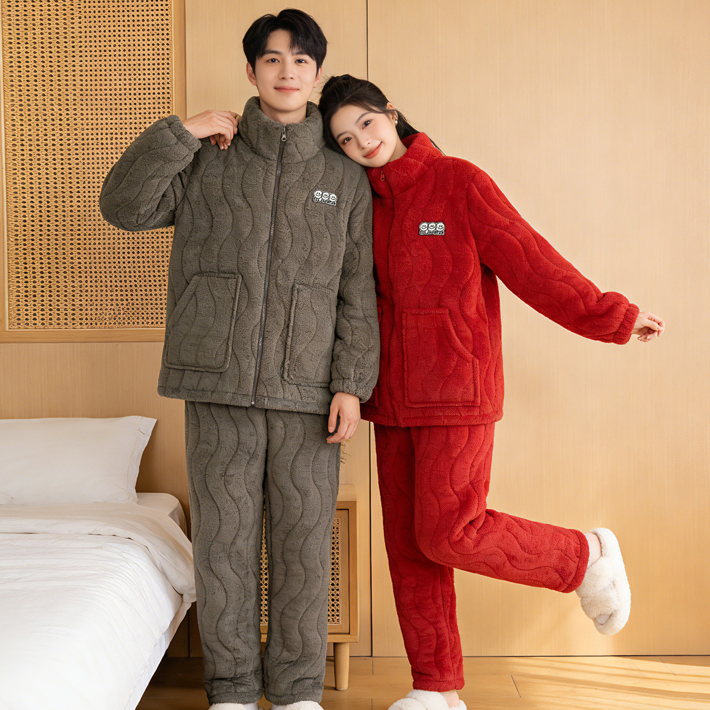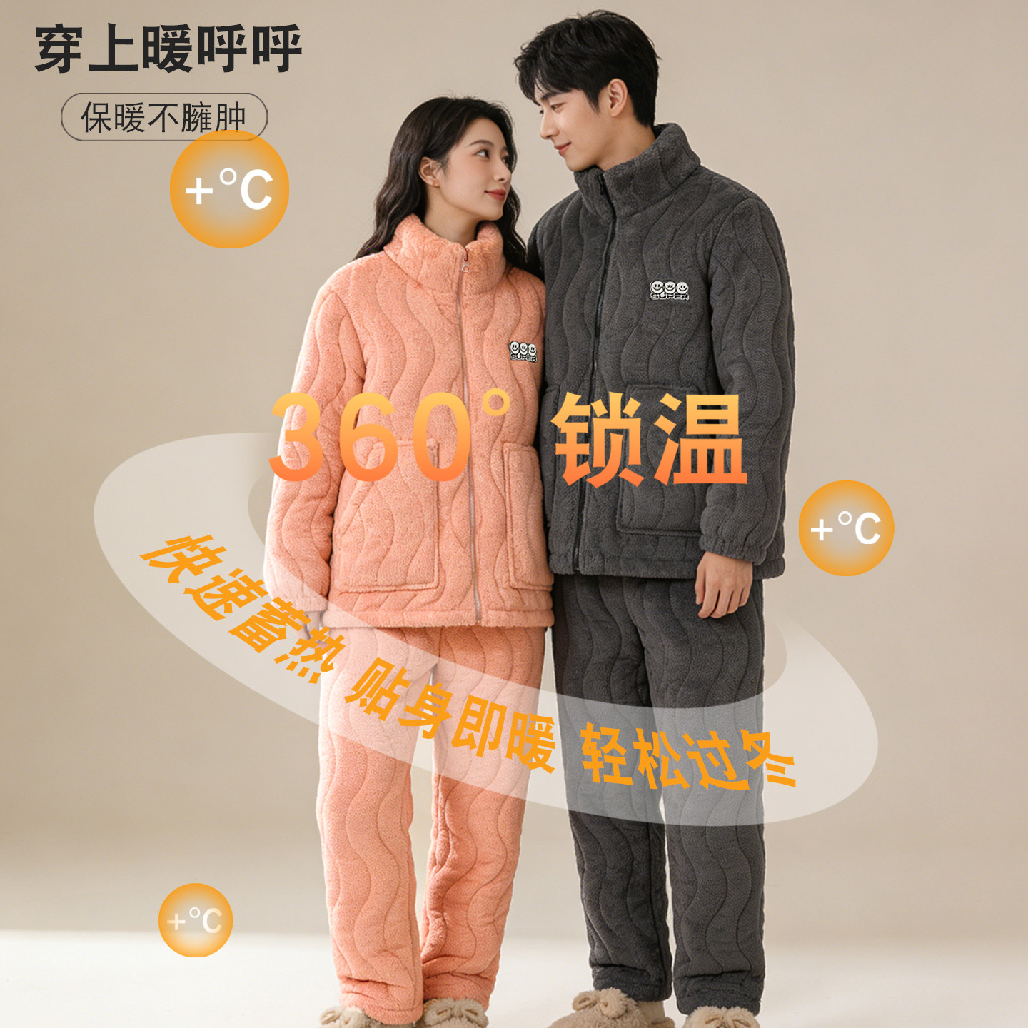 冬季情侣加厚珊瑚绒睡衣三层夹棉袄男女同款家居服可外穿套装Y210