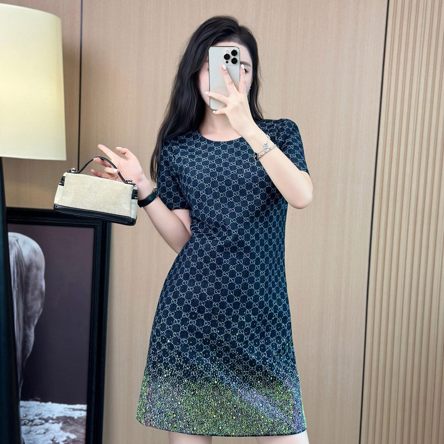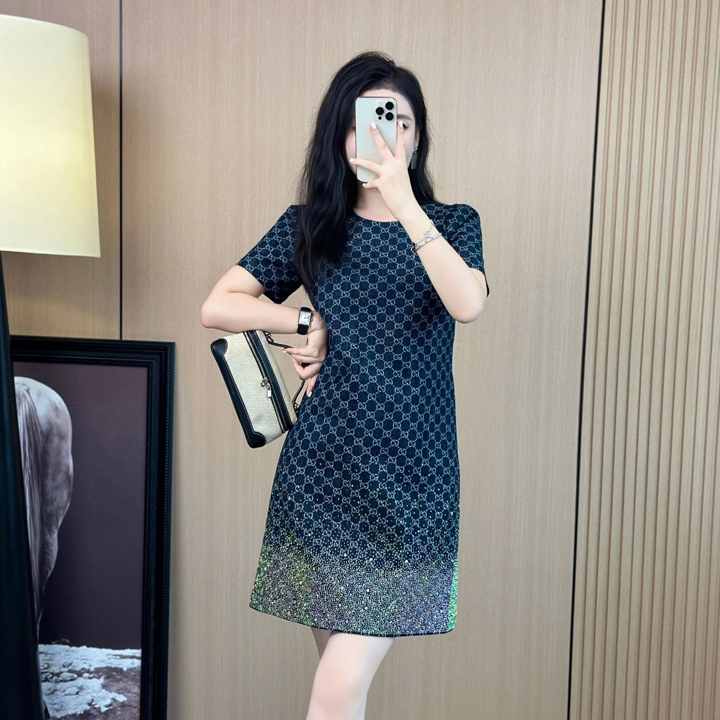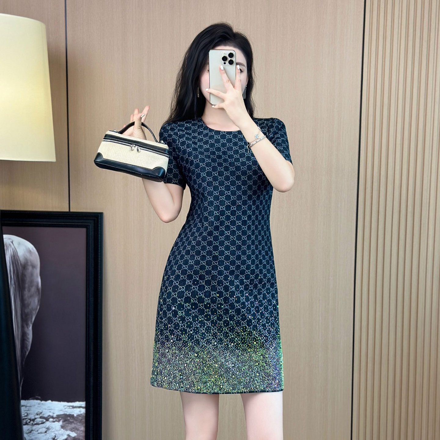 通勤穿搭裙子女装2026新款夏季小个子气质蓝色提花烫钻牛仔连衣裙