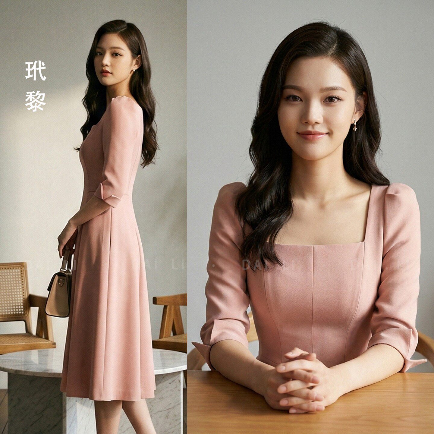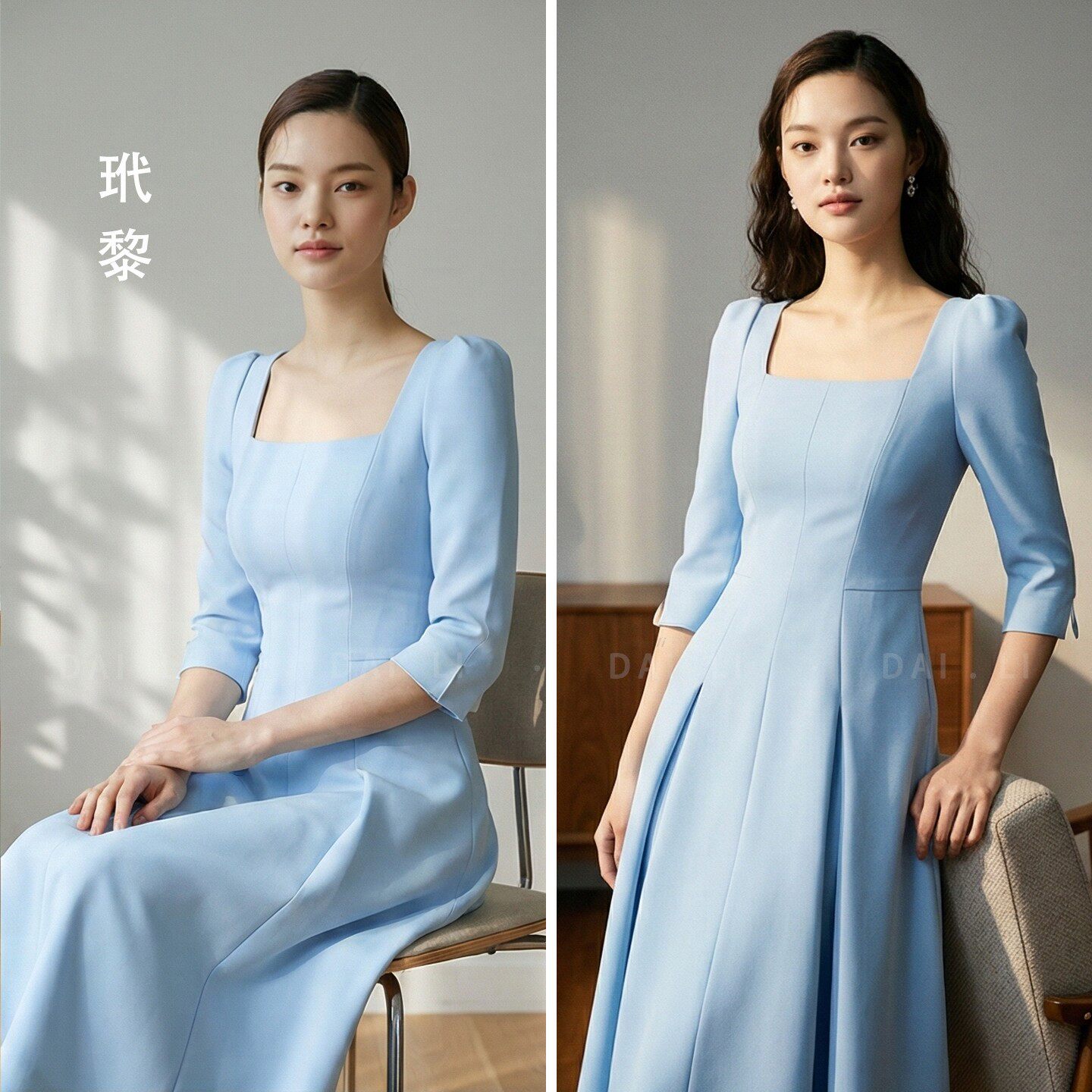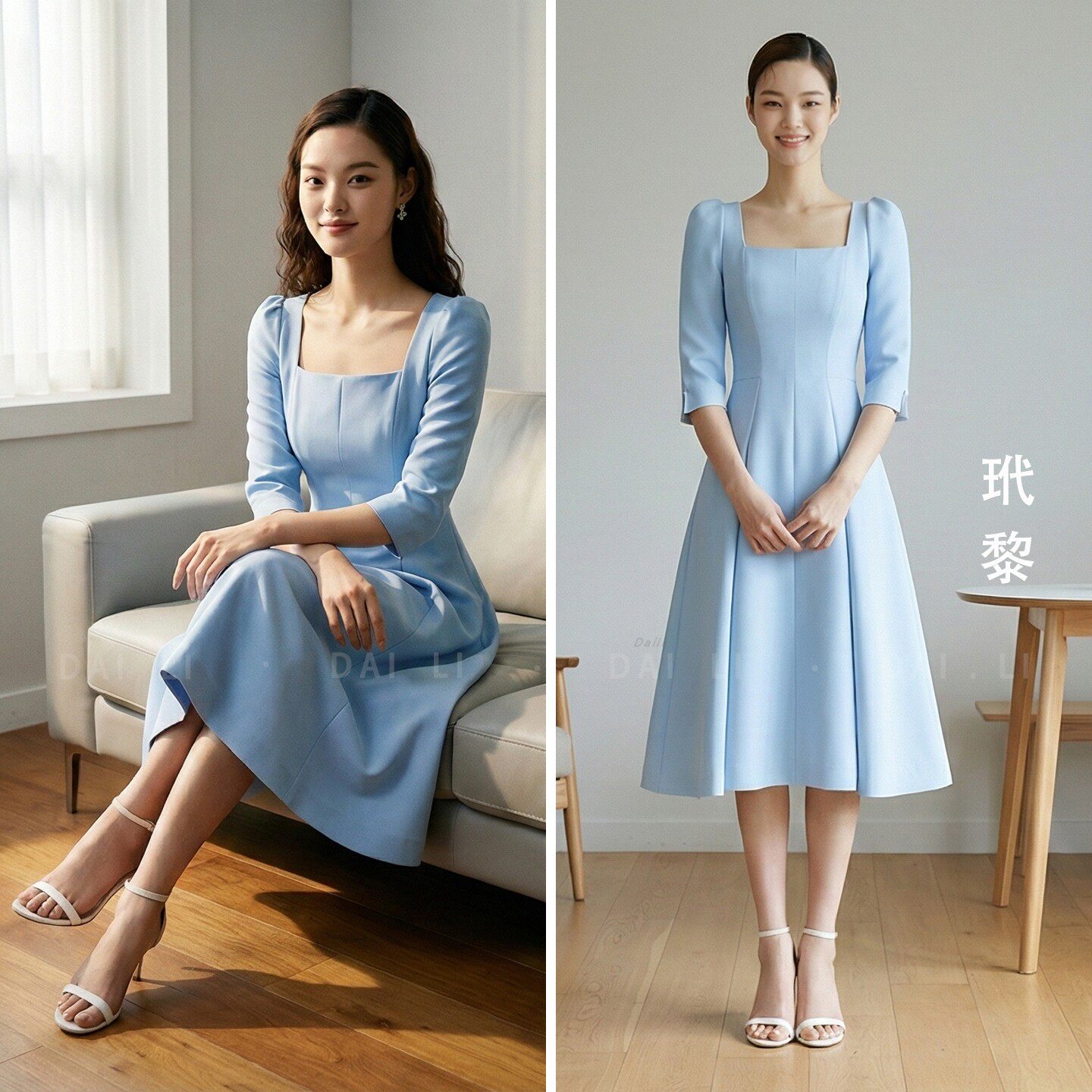 名媛风方领半袖连衣裙时尚通勤收腰A字长裙小个子修身显瘦裙子