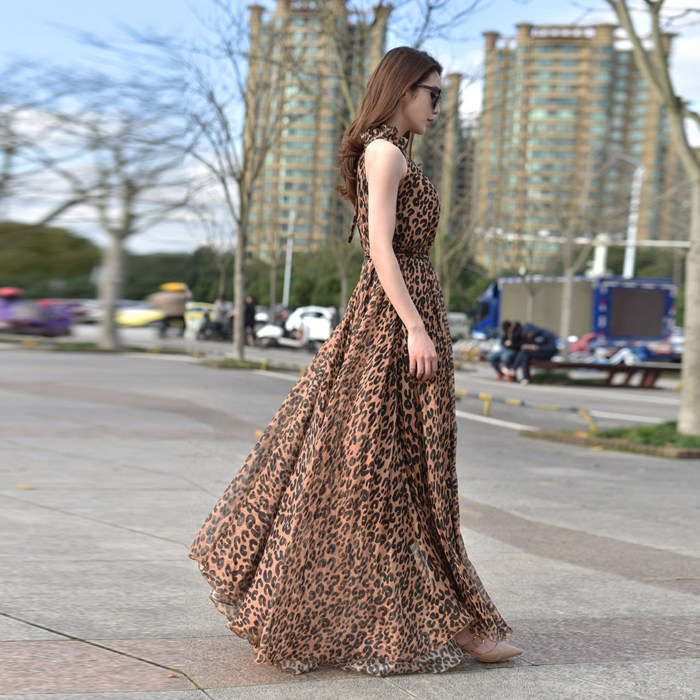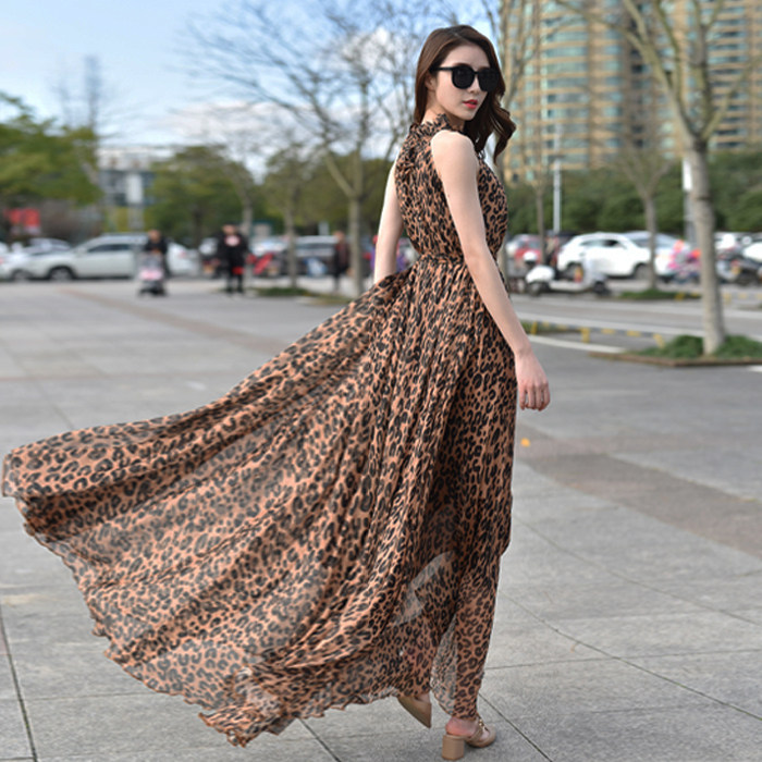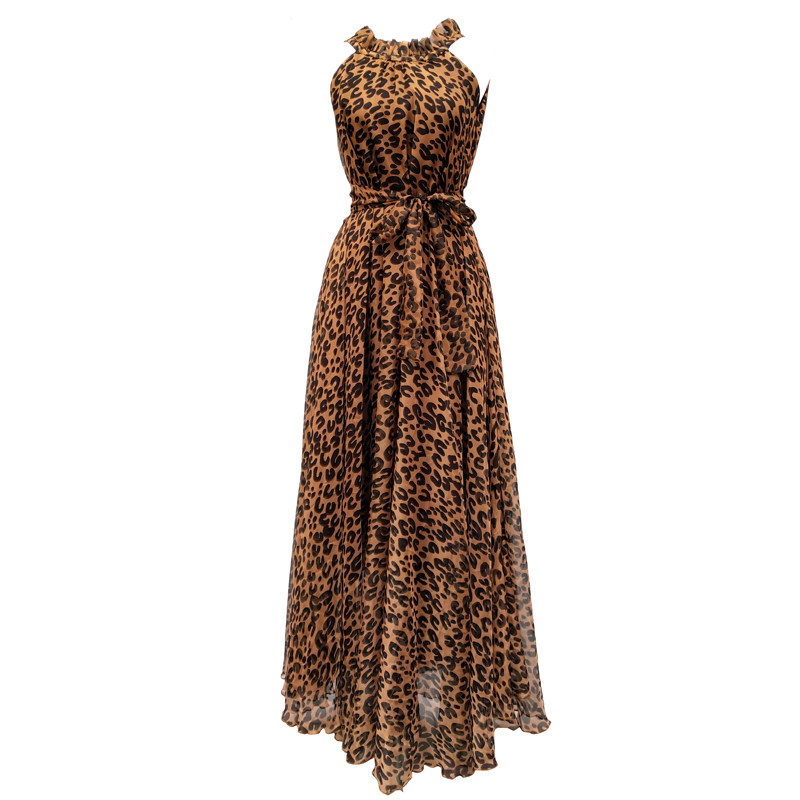 新款夏挂脖豹纹沙滩裙大码到脚踝超仙超长款裙子连衣裙长裙女