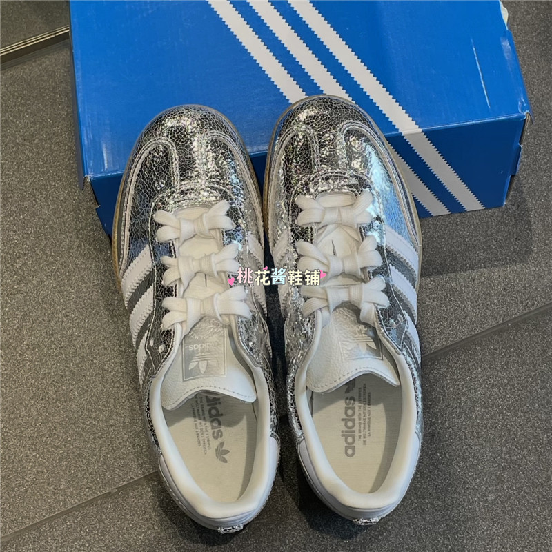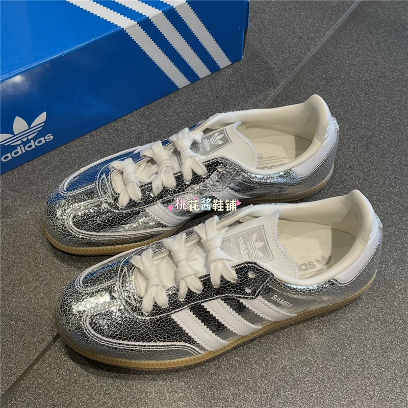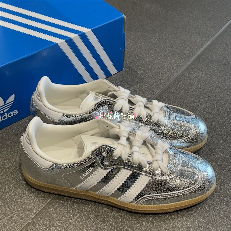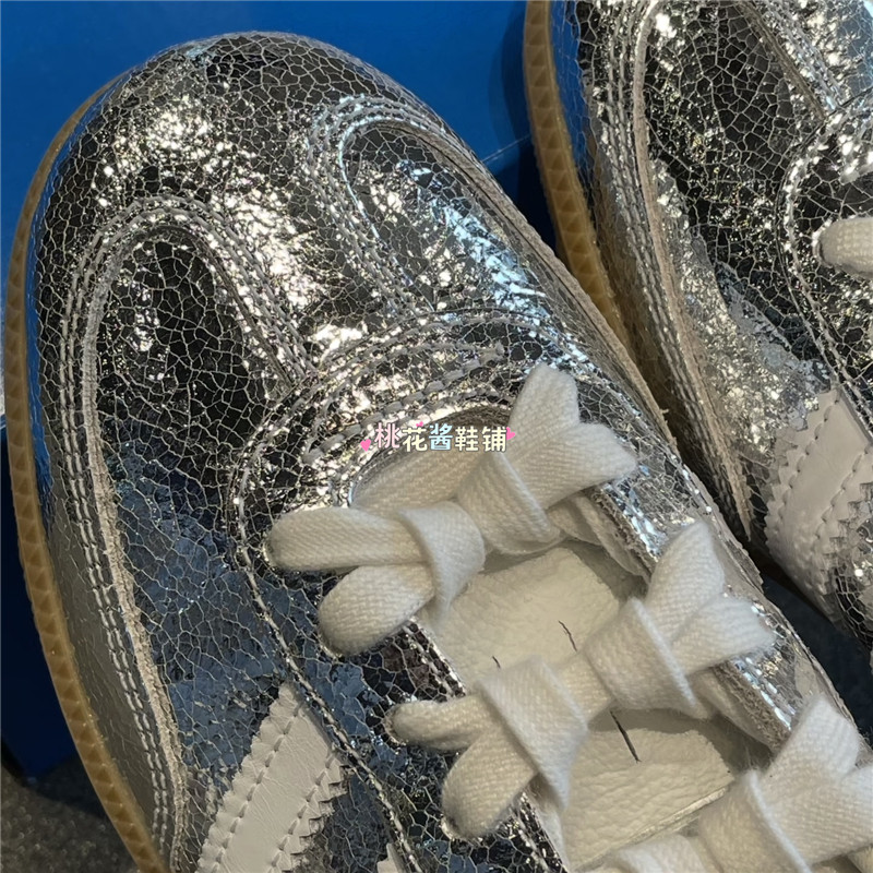 Adidas三叶草SAMBA女子德训T头鞋银色裂纹皮革运动休闲鞋 JR0035