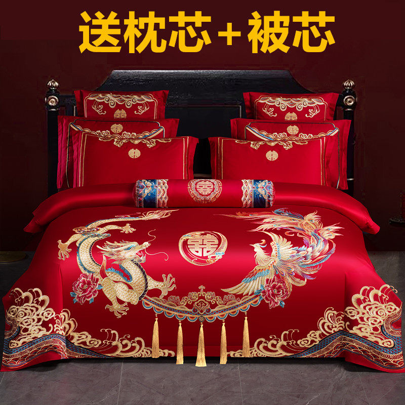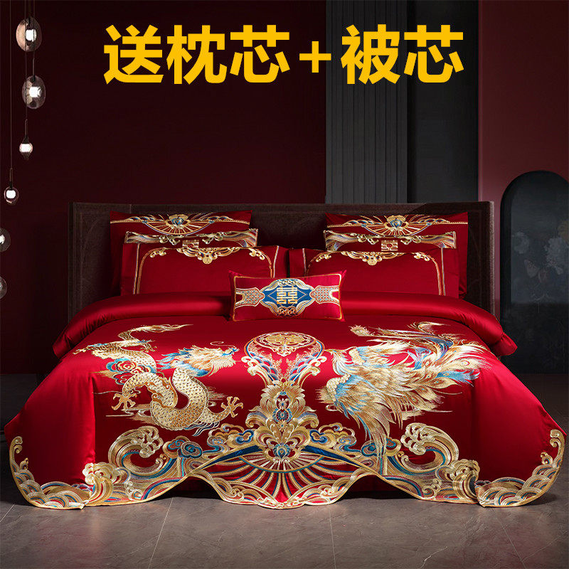 结婚长绒棉纯棉四件套全棉龙凤刺绣婚庆陪嫁新婚房用品送大红被芯