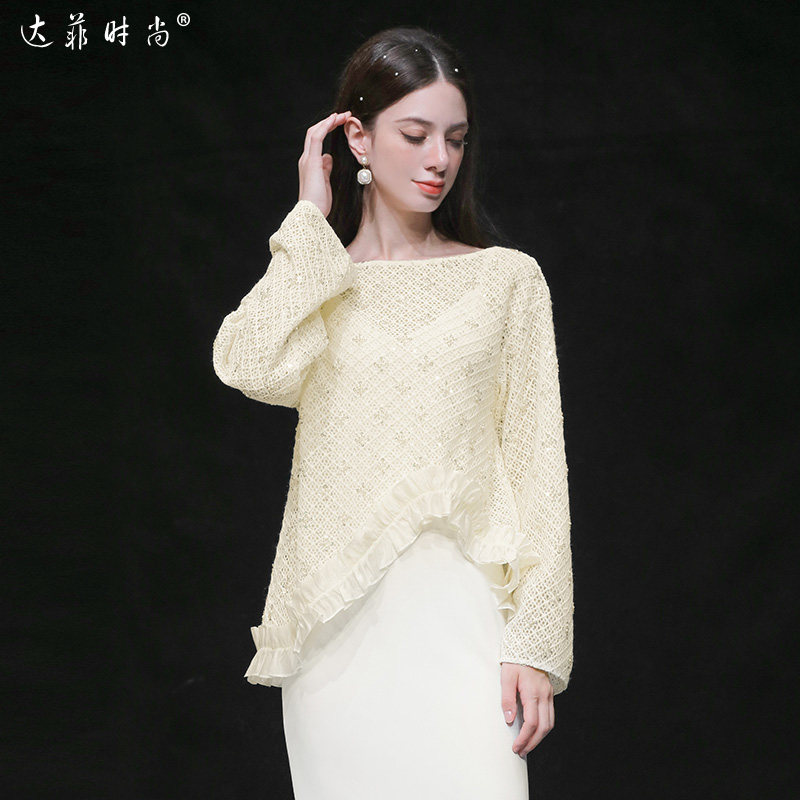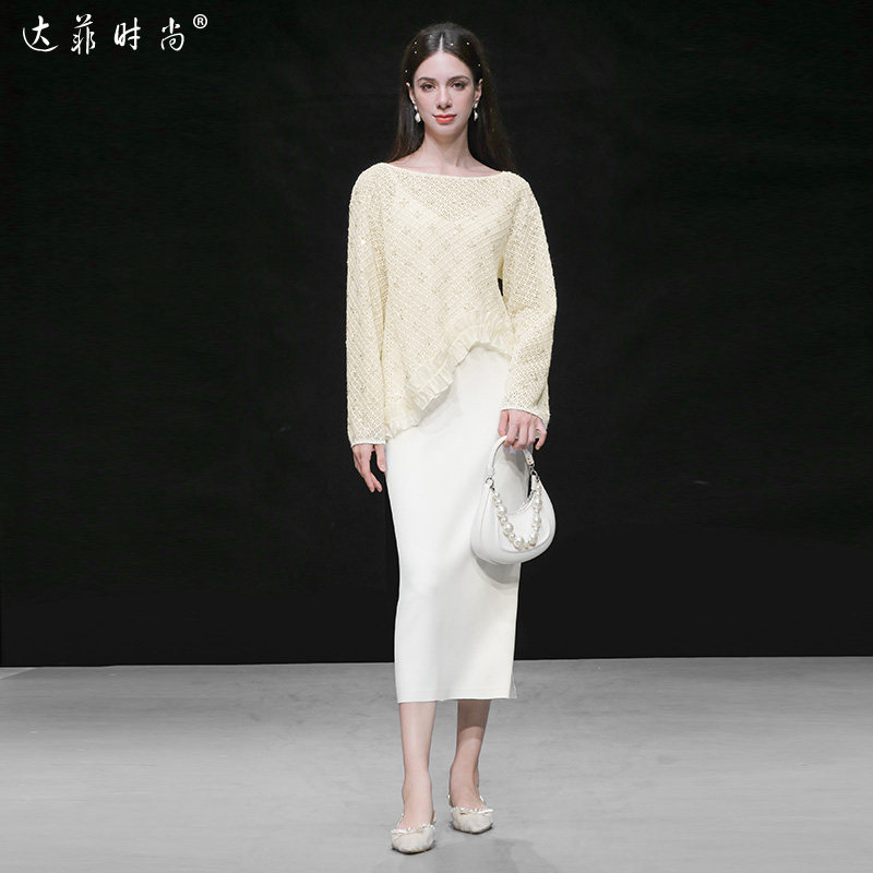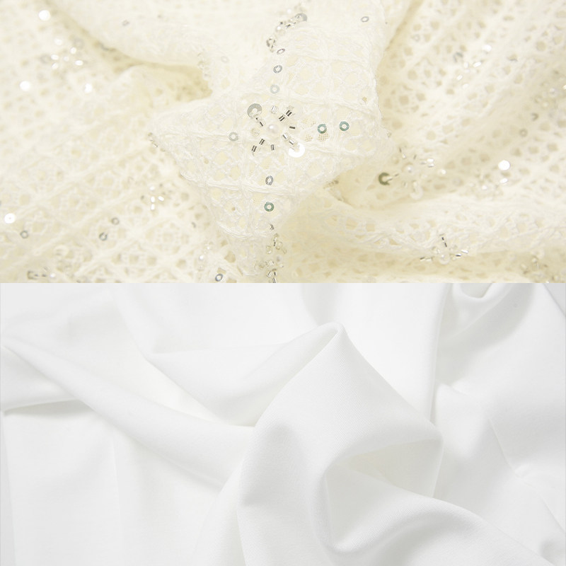 2026春季新款气质镂空珠片钩花长袖木耳边外罩衫+吊带针织连衣裙